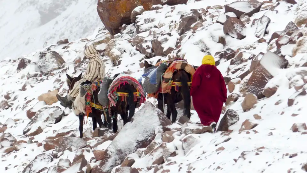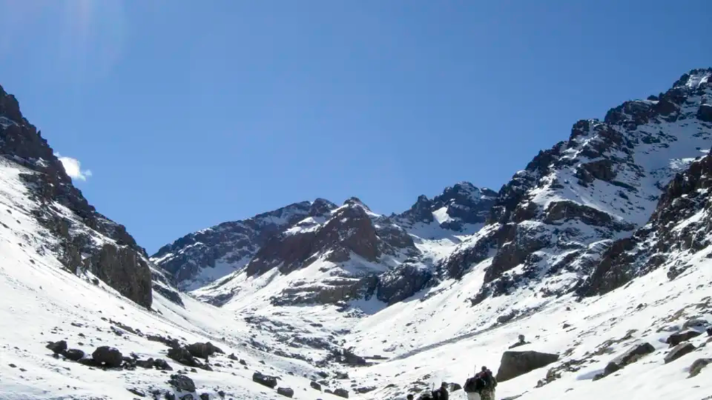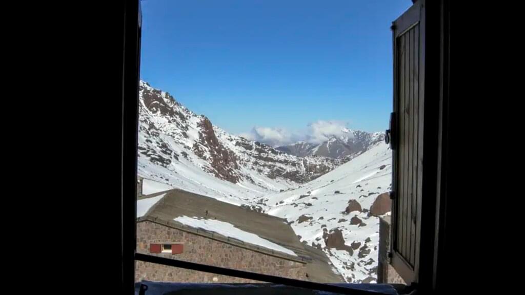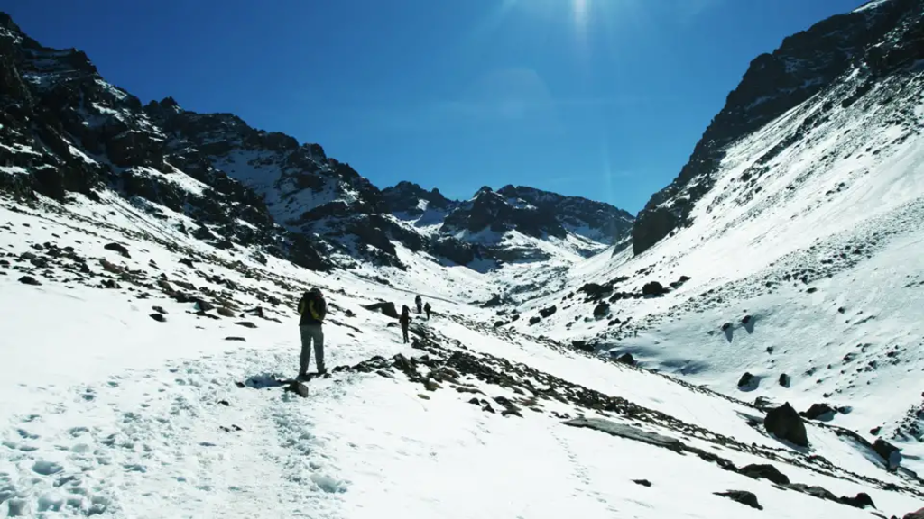 <Nach dem Frühstück teilen die Mulitreiber unser Gepäck auf und wir beginnen unser Trekking. Durch das Ait Mizane-Tal geht es zum Schrein von Sidi Chamarouch (2.350 m). Zu Ehren eines Heiligen, dem vom Volk magische Kräfte zugeschrieben werden, ist hier eine kleine Wallfahrtsstätte. Abhängig von den Schneeverhältnissen wird unser Gepäck von den Maultieren auf Träger verteilt. Der Pfad führt uns in Serpentinen weiter den Berg hinauf, es wird steiler und anstrengender. Schließlich erreichen wir das Toubkal Basecamp und die Neltner-Hütte (3.200 m). Am Nachmittag demonstriert uns unser Guide, wie man sicher mit Steigeisen und Eispickel umgeht. Nach ein paar theoretischen und praktischen Übungen fühlen wir uns fit für die kommenden Etappen. -