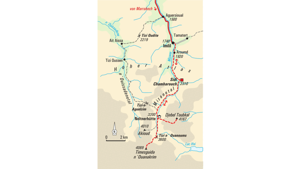 <Je nach Wetterbedingungen entscheiden wir uns heute, den Aufstieg zum Toubkal vorzuziehen. Aber in den meisten Fällen nutzen wir diesen Tag zur Akklimatisierung und machen eine Wanderung zum Tizi n'Ougane, von wo aus eine optionale Besteigung des Timesguida Ouanakrim möglich ist.Frühmorgens steigen wir stetig, meist auf Schneefeldern talaufwärts und erreichen vorerst den Tizi n´Ougane (3.750 m, Tizi = Pass). Von dort eröffnet sich ein Ausblick auf beide Seiten der Täler und in die südlichen Bergregionen. Es folgt ein steiniger Abschnitt durch Blockgestein und Geröll bzw. Schnee. Sicherungstechnik ist nicht notwendig, es gilt jedoch, trittsicher zu sein und die Hände hin und wieder am Fels zu Hilfe zu nehmen. Wir erreichen den Vorgipfel, Ras Ouanakrim (4.083 m). Von hier ist es nicht mehr weit bis zum höchsten Gipfel des Ouanakrim-Massivs, dem sogenannten Timesguida Ouanakrim (4.089 m). Belohnung für unsere Mühe ist der weite Blick über den Toubkal in den westlichen Hohen Atlas und bei guter Sicht bis in die Sahara und den Antiatlas.Es besteht die Möglichkeit am Tizi n'Ougane umzukehren und zur Neltnerhütte zurückzuwandern (↑↓ 550 m, ca. 5 Std. Gehzeit). -
