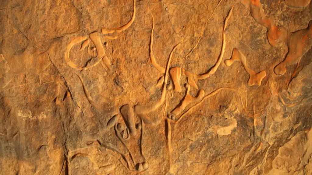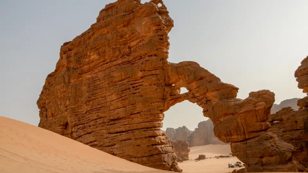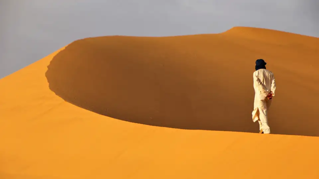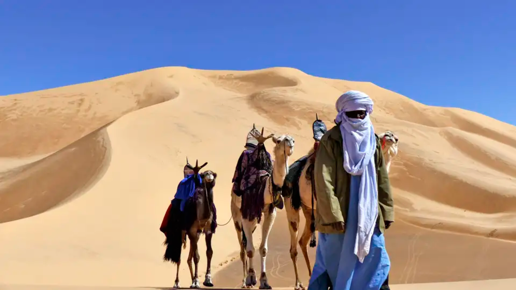 <Wir wachen in der Wüste auf. Um uns herum nichts als Weite, Sand und Felsmassive. Eine kurze Fahrt bringt uns zurück nach Djanet. Wir erledigen die nötigen Formalitäten bei der Nationalparkbehörde. Anschließend haben wir die Möglichkeit auf dem Markt noch einen Chèche (ein traditionelles, langes Stofftuch, das sich sehr gut als Sonnenschutz eignet) zu besorgen, bevor es außerhalb der Oase Djanet mit den Geländefahrzeugen zum Ausgangspunkt unseres Trekkings geht. Diejenigen, die ein Reitkamel bestellt haben, bekommen nachmittags eine Einführung im Umgang mit ihrem Kamel und werden sich nach kurzer Zeit schon sicher fühlen. Wir wandern oder reiten zu unserem heutigen Nachtlager zwischen bizarren Felsformationen auf einem Hochplateau. Zum Sonnenuntergang haben wir zum ersten Mal Blick in die unendliche Weite der Wüste. Während des vom Trekkingkoch zubereiteten Abendessens, können wir beobachten, wie die Sterne über uns allmählich zu leuchten beginnen. -