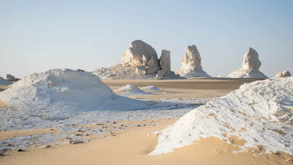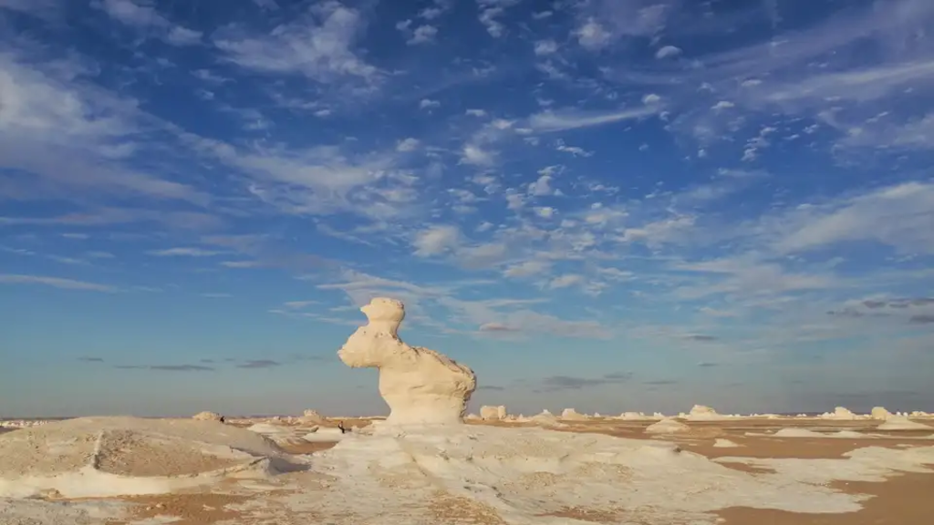 <Wir packen das Nötigste für die nächsten zwei Tage in eine kleine Tasche, während unser Hauptgepäck auf den Dächern der Geländewagen verstaut wird. Unsere Fahrt führt uns teils über unbefestigte Straßen zur Schwarzen Wüste, wo wir einen Stopp einlegen, um die mit Lavaschotter bedeckten Hügel zu bewundern. Anschließend geht es weiter zum Kristallberg, dessen weiße Kristalle in der Sonne funkeln.Von hier aus wandern wir auf sandigem Untergrund durch die Wüste, bis uns die Fahrzeuge wieder aufnehmen und wir gemeinsam zu unserem Mittagsplatz an der Quelle Ain El Serw fahren. Unter schattenspendenden Bäumen genießen wir ein frisch zubereitetes Mittagessen und eine ausgiebige Pause.Am Nachmittag setzen wir unsere Wanderung auf sandigem Untergrund fort, entlang eines ausgetrockneten Seitenarms des Nils, sanft ansteigend und abfallend. Schließlich treffen wir wieder auf unsere Fahrzeuge und fahren gemeinsam zu unserem Nachtlager am nördlichen Rand der Weißen Wüste. -