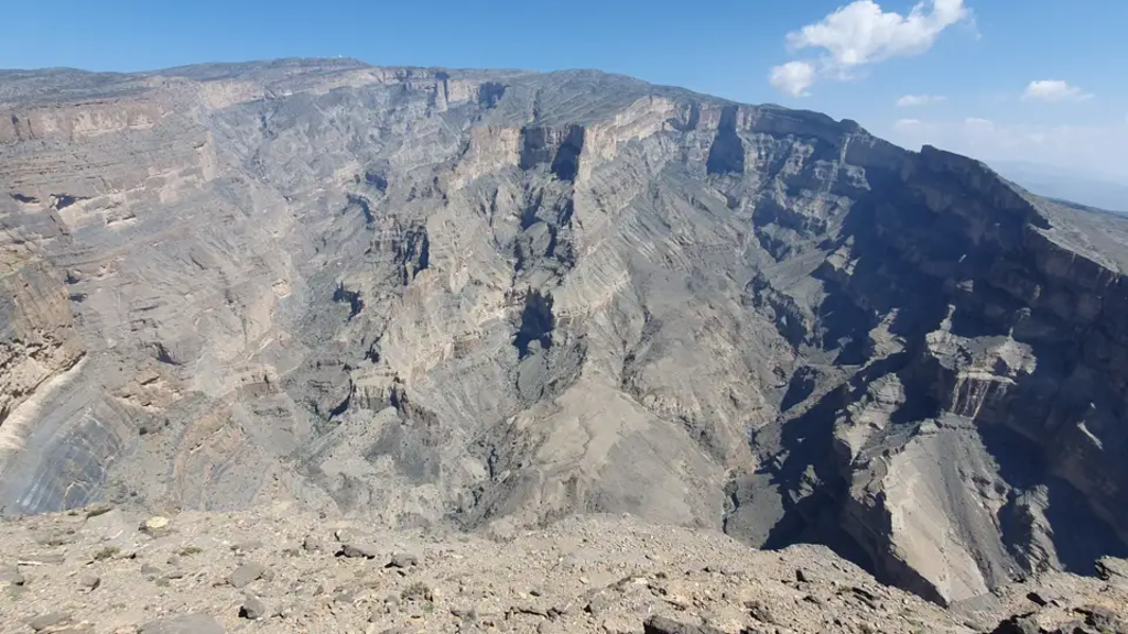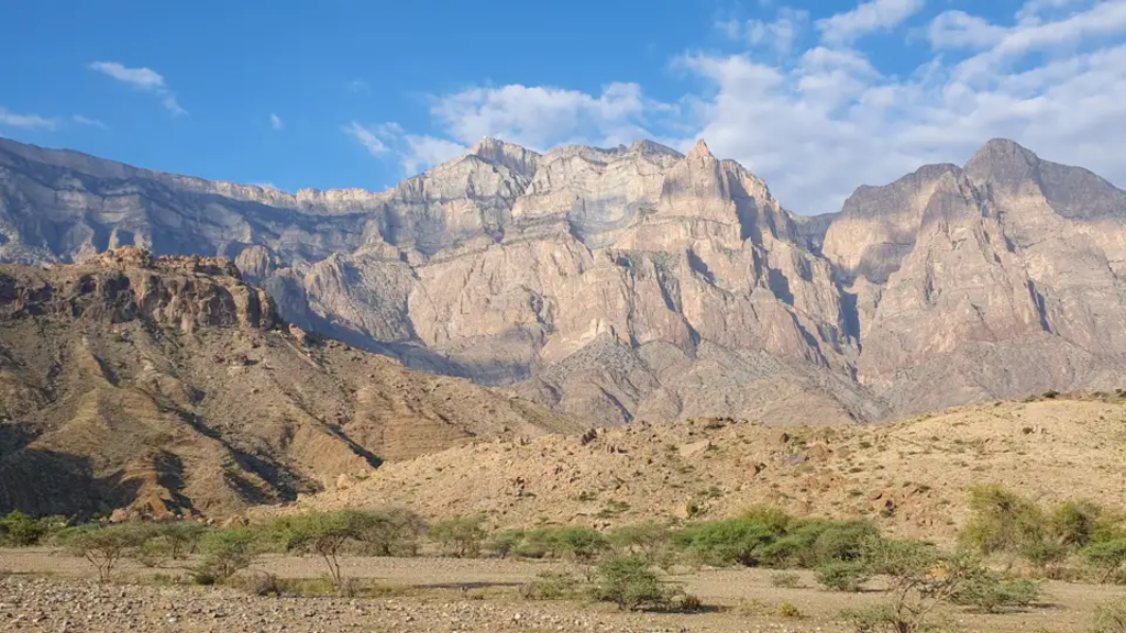<Nach dem Frühstück machen wir uns auf den Oman zu erkunden. Unsere Fahrt führt uns in die Täler der majestätischen Berge. Durchfurchte Hänge, atemberaubende Steilwände, schroffe Felsüberhänge und tiefe Schluchten präsentieren sich in einem nicht beschreibbaren Farbenspiel. Mit einer unglaublichen Vielfalt an Naturwundern zieht sich das Gebirge über eine Länge von fast 500 Kilometern durch das Sultanat. Durch den Wadi Beni Awf gelangen wir zum Wadi Sahtan: Die Straße windet sich durch eine enge Schlucht, in der entlang der Felswände Palmengärten aus Dattelpalmen, Mangobäumen und Bananenstauden angelegt sind. Am Ende öffnet sich die Schlucht zu einem großen Kessel. Wir ziehen die Wanderschuhe an und folgen auf alten Eselspfaden den Verbindungen der einzelnen Siedlungen. Vor uns die imposante 2.000 Meter steil aufragende Nordwand des Jebel Shams. -