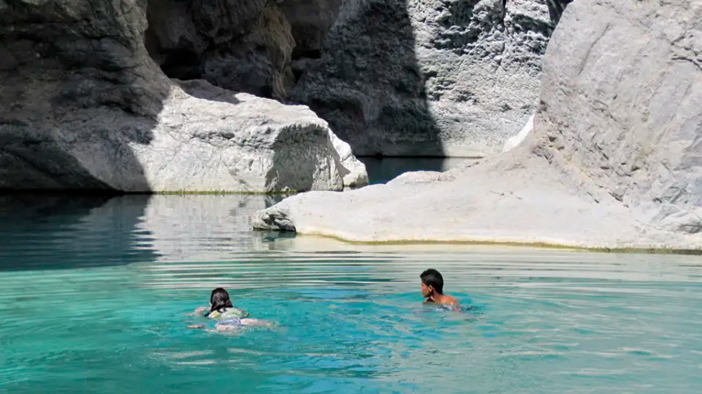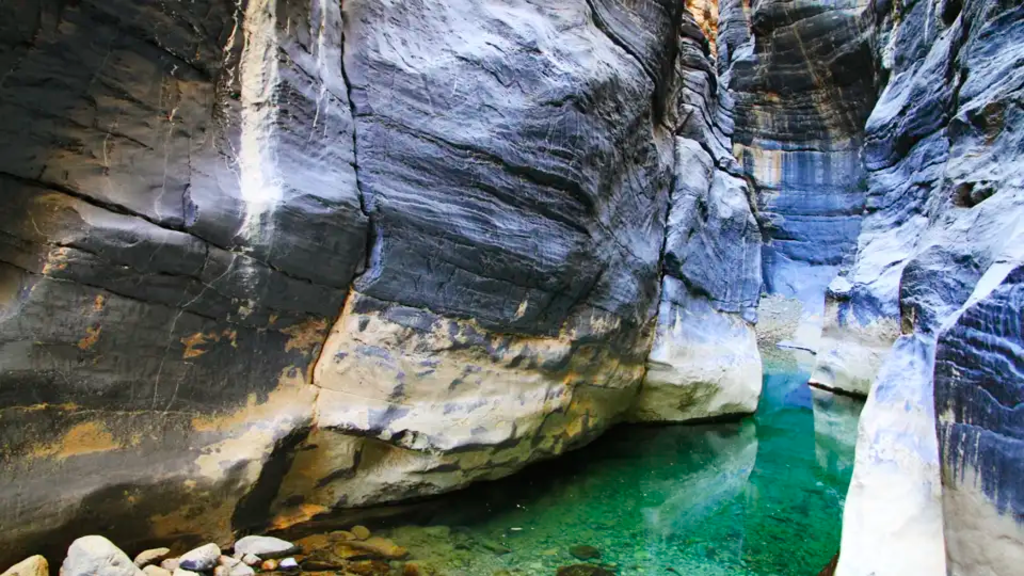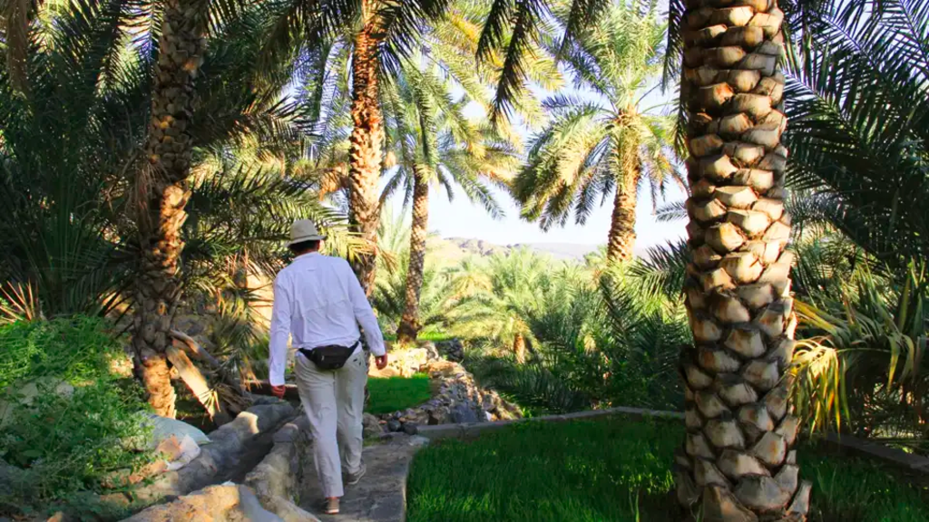 <Nach dem Frühstück fahren wir ins Wadi Shab. Hier unternehmen wir eine Wanderung in einer Schlucht wie aus dem Bilderbuch. Die Pools am Ende des Weges laden zum Baden ein. Durch einen engen Spalt in den Felsen erreichen wir schwimmend einen Wasserfall in einer wunderschönen Höhle. Im Inneren verwandelt die Sonneneinstrahlung das Wasser in ein angenehmes Türkisblau. Wir legen unser Mittagspicknick an einem natürlichen Pool ein und wandern dann den gleichen Weg zurück, um anschließend mit dem Bus in die Wüste zu fahren. Wir machen einen Stop an der Festung von Bahla ehe wir unser Ziel erreichen, die Bergoase Misfat Al Abreyeen – ein "Garten Eden". Durch die Gärten erreichen wir auch den letzten Winkel der Oase und entdecken dabei Zitronen-, Granatäpfel-, Papaya- und Mangobäume. Diese Gärten werden mit Hilfe der Falaj-Systeme seit Jahrhunderten kultiviert, über dessen Geschichte wir hier im Detail erfahren. Wir übernachten in einem der alten Häuser des Dorfes. -