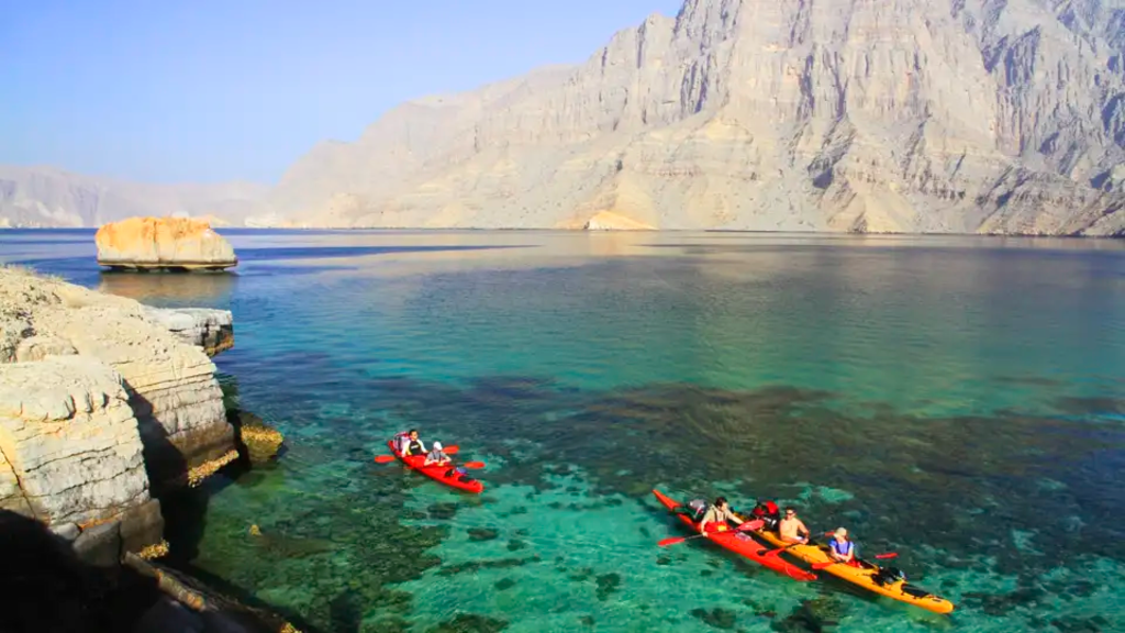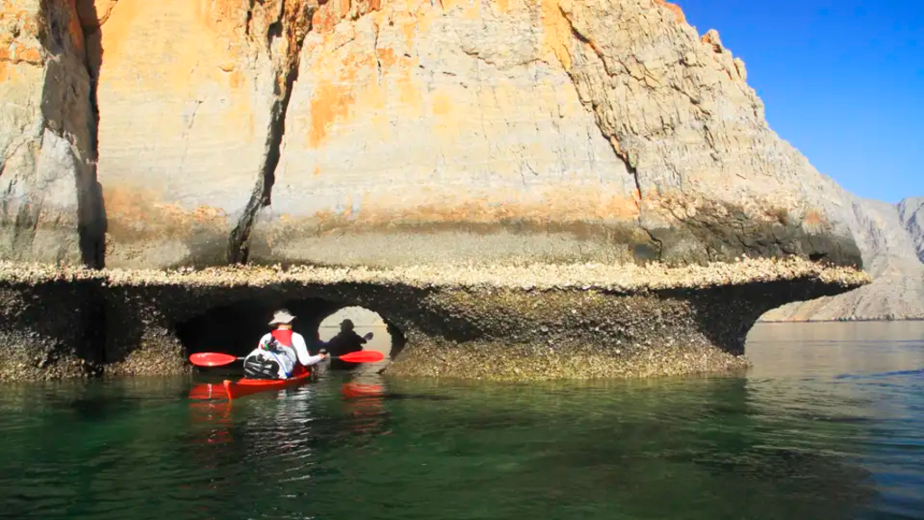 Wander- und Kajakreise zwischen Maskat, Jebel Shams und der Musandam HalbinselUm uns herum thronen steile Felswände. Unsere Paddel tauchen rhythmisch ins türkisblaue Meerwasser ein, während wir über bunte Korallengärten gleiten. An einer kleinen Insel mit Fischerdörfern legen wir an und wandern hinauf zum Aussichtspunkt. Von dort bestaunen wir den Ausblick über die Halbinsel von Musandam. An einer ihrer Buchten mit hellem Kiesstrand ziehen wir unsere Kajaks an Land – hier bleiben wir. Zeit für ein erfrischendes Bad, fürs Schnorcheln im türkis schillernden Indischen Ozean oder einfach Zeit um die Seele baumeln zu lassen inmitten der fjordähnlichen Welt aus Klippen und Buchten. Auf dem quirlig-bunten Markt in Nizwa lassen wir uns in die Geheimnisse berühmter arabischer Gewürzhändler einweihen. Wir erkunden uralte Lehmbau-Burgen und wandern zu Oasen entlang traditioneller omanischer Bewässerungskanäle. Wir durchschwimmen und erkunden das Wadi Shab mit seinen smaragdfarbenen Felsenpools und erholen uns in der wohltuend schattigen Oase Misfat Al-Abreyeen. Ganz traditionell wohnen wir dort in einem authentischen Dorfhaus. Vom Jebel-Shams-Plateau blicken wir erstaunt in die uns umgebende Landschaft. Ob Wüste oder Wasser: Der Oman steckt voller Magie! Unser frisch geangelter Fisch wird am knisternden Lagerfeuer zubereitet. Unvergessliche Nächte verbringen wir in unseren Zelten direkt am Strand: hier lauschen wir dem gleichmäßigen Rauschen der Wellen und blicken hinauf zum unendlichen Sternenzelt aus 1001er Nacht.