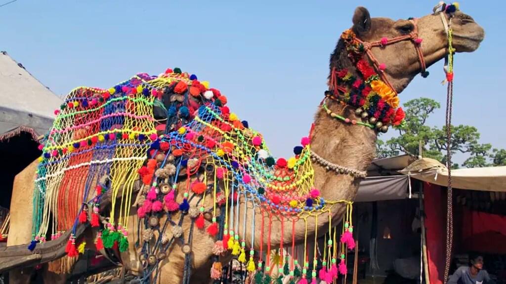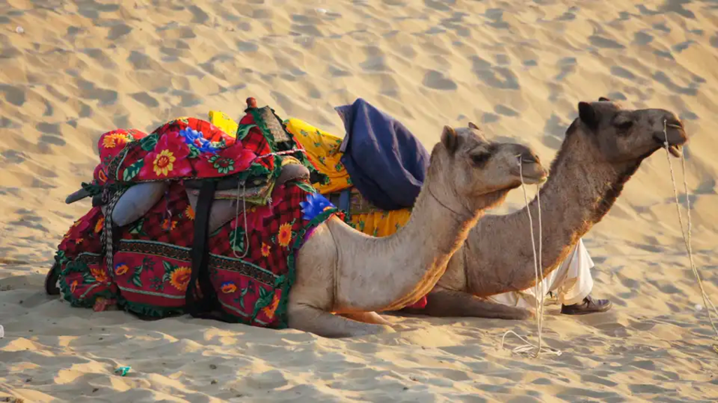 <Wir machen uns auf zu einem Highlight unserer Reise: In Kalathal warten schon die Kamele für unser Kameltrekking. Wir lernen unsere Begleitmannschaft kennen und steigen mit Hilfe unseres Kameltreibers in den Sattel. Die Campingausrüstung und unsere Vorräte werden auf die Kamelwagen verladen und dann brechen wir auf unseren "Wüstenschiffen" schwankend in die Landschaft der Wüste Thar auf. Auch in dieser kargen, trockenen Gegend gedeihen einzelne Gehölze sowie Gräser und zwischendurch treffen wir sogar auf einige Getreidefelder. Wir kommen immer wieder auch durch besiedeltes Gelände. Wenn dann am Abend die Sonne golden hinter dem Horizont verschwindet, die Kamele abgesattelt und die Zelte aufgebaut sind, erwartet uns ein Abendessen in einmaliger Umgebung. -