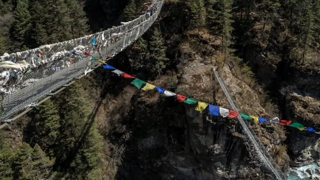 <Weiter nordwärts überqueren wir mehrmals den Fluss auf langen Drahtseilbrücken. In Jorsale befindet sich der Eingang zum Sagarmatha-Nationalpark. Nach insgesamt 3 - 4 Std. Gehzeit stromaufwärts erreichen wir den Zusammenfluss von Nangpo und Imja zum Dudh Kosi (2.850 m). Hinter der Stahlbrücke über die Imja-Schlucht bewältigen wir in etwa 2 Std. den steilen Aufstieg zum berühmten Sherpa-Zentrum Namche Bazar (3.440 m). Wir richten uns in unserer Lodge ein und können noch einen Rundgang durch die Geschäfts- und Souvenirstraße unternehmen. -