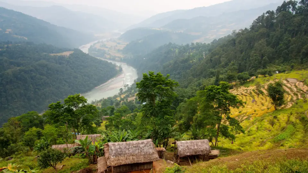 <Morgens werden wir wieder zum Flughafen gebracht und fliegen nach Tumlingtar (ca. 400 m) im Osten Nepals. Hier treffen wir unsere Begleitmannschaft. Nachdem unser Material verstaut wurde und wir zu Mittag gegessen haben, fahren wir mit dem Jeep durch das Arun-Tal, nahe der Grenze zu Sikkim, bis nach Num. Die fruchtbare Landschaft und der Fluss Arun, der sich durch eines der tiefsten Durchbruchtäler Nepals fräst, machen die Fahrt abwechslungsreich. -