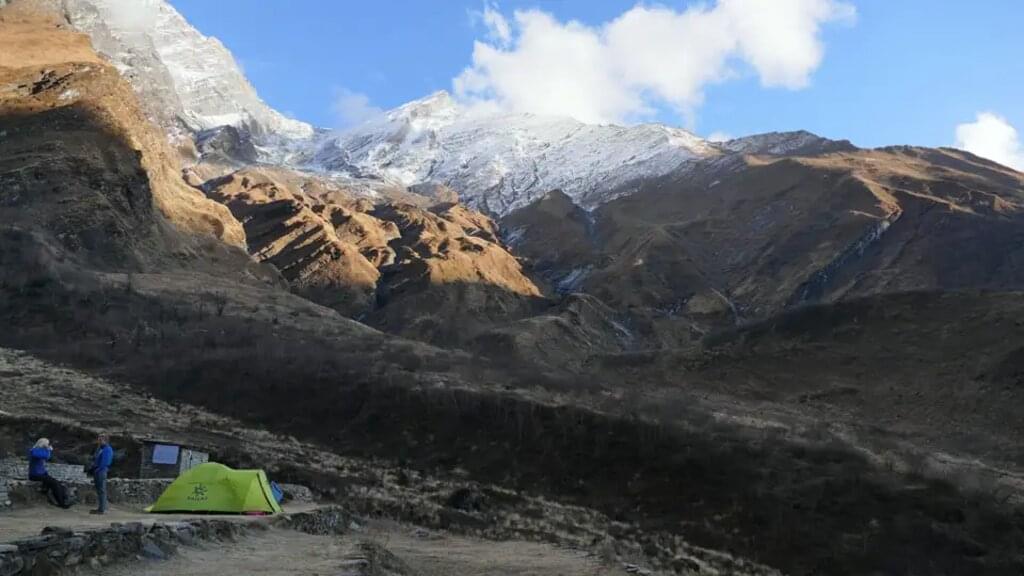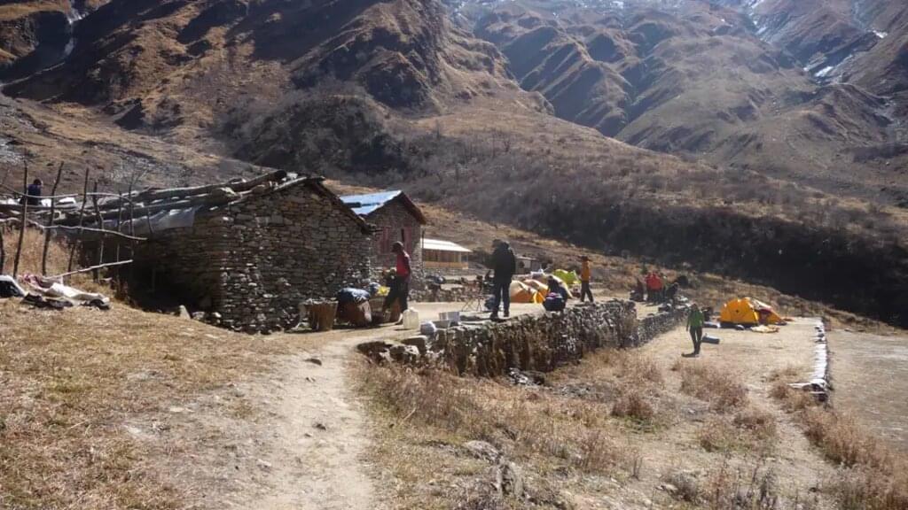 <Wir steigen langsam zum Bagar Khola hinab. Am gegenüberliegenden Hang sehen wir das Gurung-Dorf Chim Khola, das sich perfekt in die Umgebung anpasst. Vom Tal folgen wir einem breiten Weg nach Gyasi Kharka hinauf - Manapati und Dhaulagiri mit im Blick! Kaum oben, geht es wieder hinunter zum Raughat Khola, den wir über eine Brücke queren. Steile Steinstufen führen uns auf der gegenüberliegenden Flussseite nach Chaurkhani, ein Dorf das sowohl von Gurung als auch Magar bewohnt wird. Nach der Mittagspause wandern wir das letzte Stück bis zu unserem Lagerplatz auf der Alm Pahiro Kharka (2.150 m). -