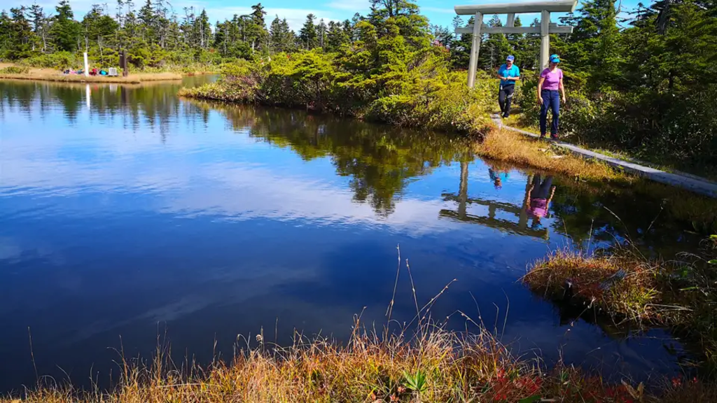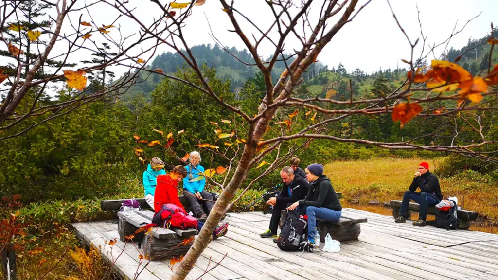 <Nach dem Frühstück schnüren wir heute zum ersten Mal unsere Wanderschuhe. Der Bus bringt uns in den Shiga-Naturpark, wo wir dem Ikemeguri-Nature-Trail folgen. Der Weg führt uns durch eine wunderschöne Naturlandschaft, vorbei an Seen, Teichen und Sümpfen. Dichte Wälder bedecken die Berge und das bunte Laub der Bäume sorgt für eine herrliche Herbststimmung. Wir steigen auf zum Gipfel des Mount Shigayama (2.040 m) und genießen unser Mittagspicknick. Anschließend wandern wir weiter bis nach Maruike, von wo uns der Bus zurück nach Yamanouchi bringt - wie wäre es mit einem Bad im Onsen vor dem Abendessen? -