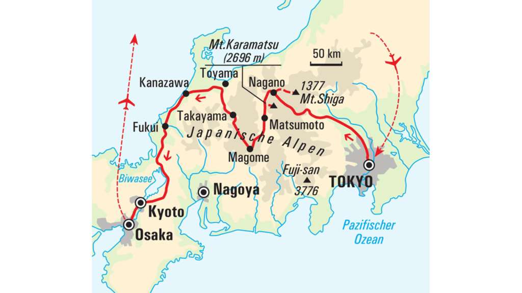 Wanderreise durch die Japanischen Alpen von Tokyo nach KyotoAffen liegen faul in heißen Quellen, rote Libellen blitzen in der Sonne. Die knorrigen Bäume biegen sich vom Gewicht der reifen Kaki-Früchte. Ein alter Mann gießt seine Bonsaibäumchen vor dem Haus und schenkt mir im Vorbeigehen ein Lächeln. Obwohl ich seit vielen Jahren durch die Japanischen Alpen wandere, begeistern mich die faszinierenden Bilder immer wieder aufs Neue. Die Ursprünglichkeit nimmt uns mit auf eine Zeitreise weit weg vom Alltag. (Norbert Berger)Wir wandern durch duftende Zedernwälder und rauschende Bambushaine, wir folgen alten Pilgerpfaden und traditionellen Handelswegen und steigen auf den aussichtsreichen Gipfel des Karamatsu-Dake. Auf dem "Ikemeguri-Nature-Trail" in der Shiga-Hochebene folgen wir den vom Herbstlaub gefärbten Alleen, auf der historischen Salzstraße "Shio No Michi" den zahlreichen Buddha-Skulpturen und auf dem "Nakasendo-Trail" den Spuren der Samurai durch die Berge. In Matsumoto besuchen wir die imposante Krähenburg, in Magome das historische Teehaus und in Takayama die Sake-Brauereien in der Altstadt. Neben den verschlafenen Dörfern des Hinterlandes erleben wir in den Städten den vollen Kontrast: Der Geist der alten Zeit flattert noch immer durch die buddhistischen Tempel und Shinto-Schreine von Kyoto, die Moderne strahlt uns in den futuristischen Gebäuden und knalligen Leuchtreklamen von Tokyo entgegen. Wir lernen mit Norbert die Gesichter Japans kennen, genießen Einblicke in tief verwurzelte Traditionen und Ausblicke auf die Technik der Zukunft. Und dabei verfallen wir ganz sicher dem Charme der Gegensätze.