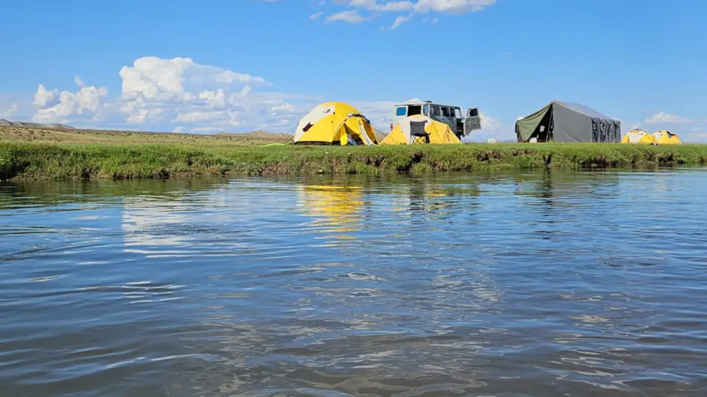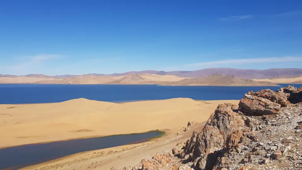 <Nach dem Frühstück im Hotel werden wir zum Flughafen gefahren und treten am Mittag den Inlandsflug in die Provinz Zavkhan nach Uliastai (Flughafen Donoi) an. Der Flughafen ist etwa 30 km außerhalb der Ortschaft Uliastai gelegen. Unsere Begleitmannschaft für die nächsten Tage wartet bereits auf uns und wir brechen auf die Fahrt zum Fluss Zavkhan auf. Unterwegs legen wir eine Mittagsrast ein. Unsere Mannschaft hat bereits eine Mahlzeit vorbereitet. Der Fluss Zavkhan fließt entlang des Dünenfeldes Mongol Els, welches sich über 300 km Länge und 30 km Breite erstreckt. Wir richten unser Zeltlager für zwei Nächte direkt am Flussufer mit Blick auf das Dünenfeld ein. -