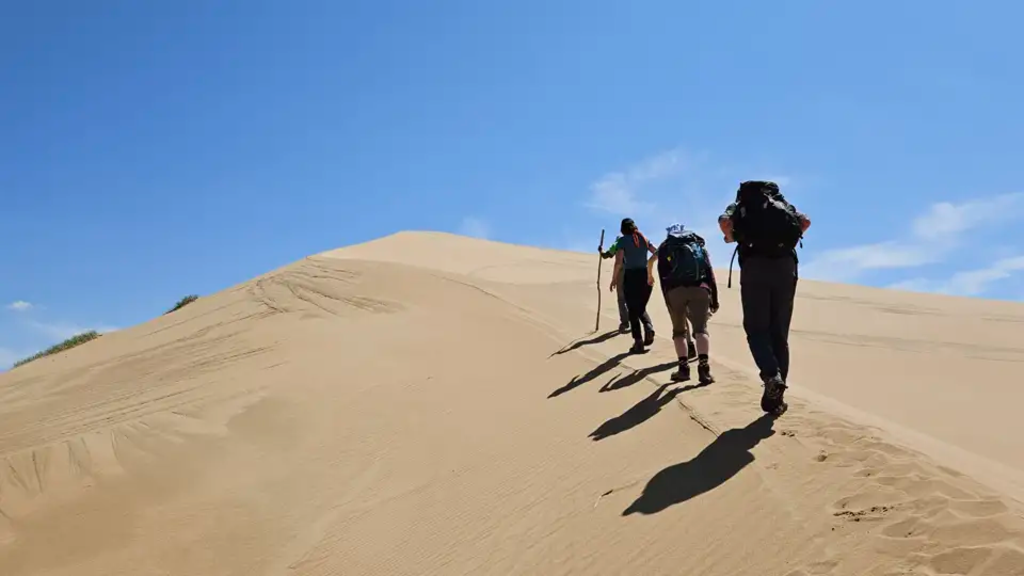 <Wir brechen möglichst früh auf, bevor die Mittagshitze das Wandern erschwert. Zuerst durchqueren wir den Fluss an einer seichten Stelle – der Flussgrund besteht aus feinem Sand – und wandern dann hinein in das Dünenfeld. Das sich vor uns ausbreitende Dünenmeer ist spektakulär und bietet einige schöne Fotomotive. Für das Mittagessen kehren wir zurück zu unserem Zeltlager. Der Rest des Tages steht zur Entspannung am Flussufer zur Verfügung. Wer möchte, kann zu einem südlich, nahe gelegenen, kahlen Berg wandern (ca. 2 Std., ca. ↓↑ 270 m). -