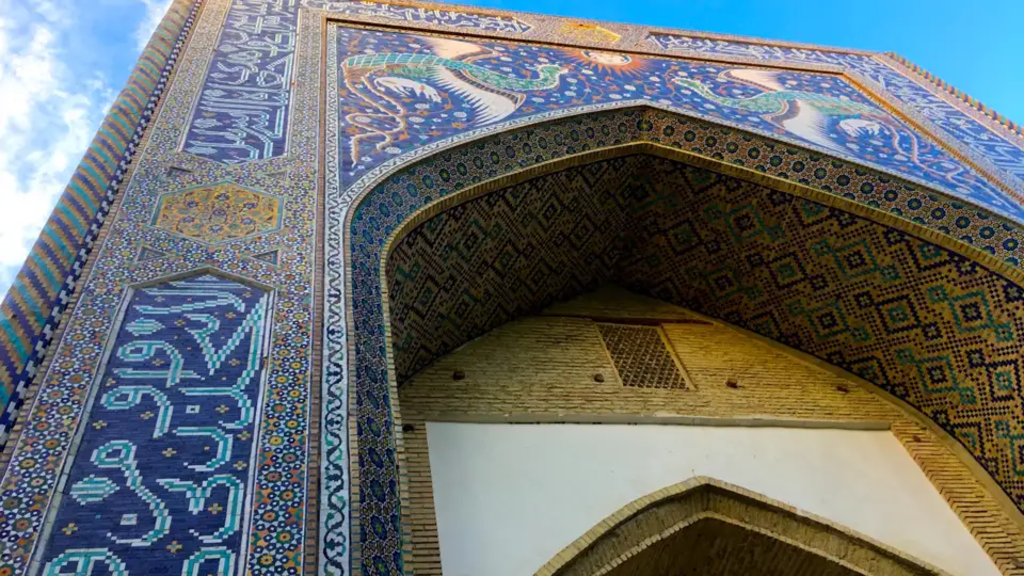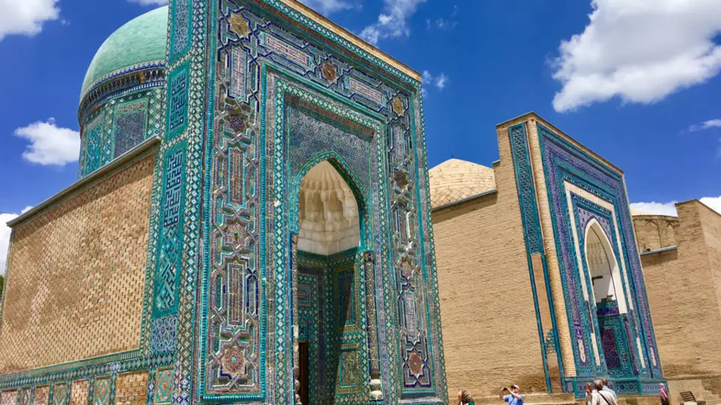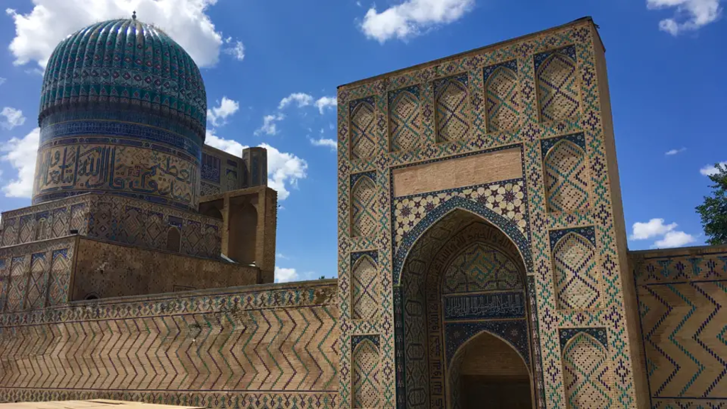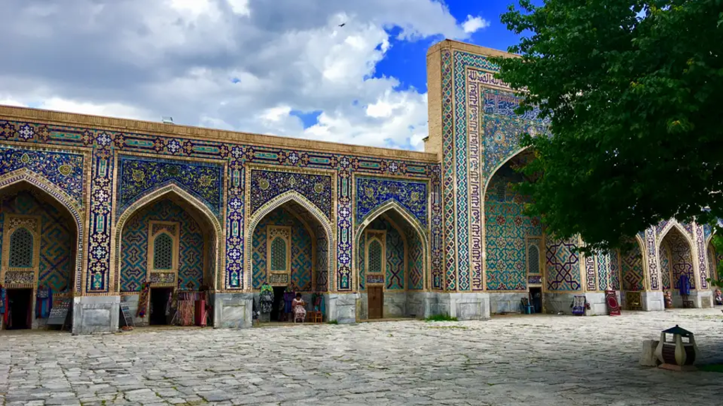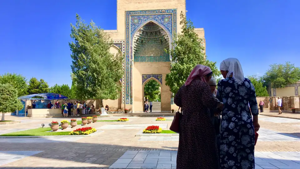 <Wir stehen früh auf und fahren nach dem Frühstück zum Bahnhof – ein Hochgeschwindigkeitszug bringt uns von hier nach Samarkand. In dieser modernen Stadt, die es geschafft hat, das Flair einer märchenhaften Oasenstadt zu bewahren, treffen wir um ca. 10 Uhr ein. Den heutigen Tag nutzen wir bereits für erste Besichtigungen. Wir statten dem Gur-Amir-Mausoleum, der Bibi-Khanum-Moschee und dem Herz des antiken Samarkands, dem Registan-Platz, einen Besuch ab. Das Ensemble am Registan-Platz besteht aus den drei Medresen Ulugbek, Tilla-Kori und Sher-Dor und wird von deren mächtigen Portalen bestimmt. -