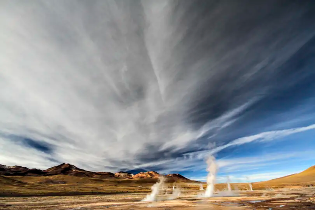 <Eine landschaftlich schöne Wanderung bringt uns zu den Thermalquellen von Puritama (3.330 m). Mit Genuss ruhen wir uns etwas in den mit heißem Wasser gefüllten Becken aus. Ein kurzer Fußmarsch führt uns anschließend aus dem Canyon heraus und wir machen uns mit den Fahrzeugen auf den Weg zu den berühmten Tatio-Geysiren auf 4.321 m Höhe. 6.000 m hohe Vulkane ragen am Horizont auf, das vegetationslose Gestein schillert in bunten Farben. Auf den weiten Hochebenen zwischen den Bergrücken leben Vicuñas, die wir mit etwas Glück von der Straße aus beobachten können. -