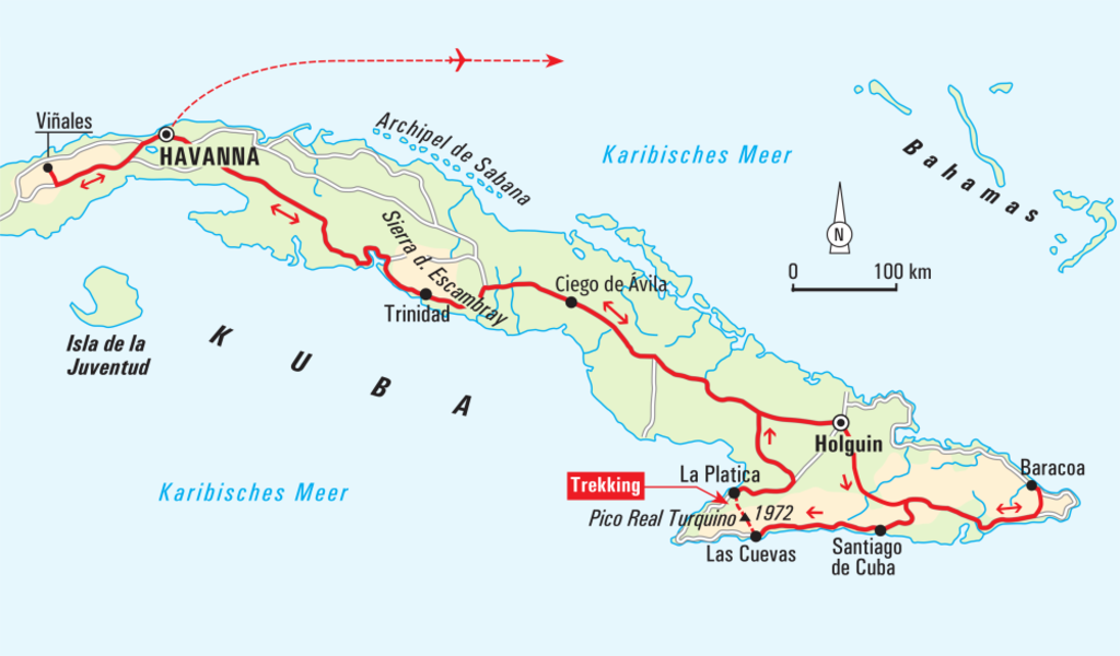 „Bergsteigen verbrüdert Menschen“ - schrieb José Martí, kubanischer Nationalheld und Poet in seinem Kampagnentagebuch. Für die Kubaner ist der Pico Turquino das Dach ihres Vaterlandes, das Sinnbild für Erfolg des menschlichen Lebens: „Den höchsten Punkt erreicht man mit Willen, Aufwand und Kollektivismus“. Wir werden dieselben Wege begehen, auf denen schon die Revolutionsführer Fidel Castro und Ché Guevara gegangen sind. Wir folgen ihren Pfaden, durchqueren die Sierra Maestra mit den Bergnebelwäldern, erklimmen den Pico Turquino und steigen ab bis zur Comandancia de la Plata, dem Hauptquartier der damaligen Revolutionsführer. Bei unseren Begegnungen mit den Kubanern in kleinen Dörfern erfahren wir viel über die alten Zeiten. Wir erwandern verborgene Winkel Kubas, in denen das Leben in einem langsameren Rhythmus läuft und die Natur die Hauptrolle spielt. Im Viñales-Tal erfahren wir aus erster Hand von einem Tabakbauern wie man eine kubanische Zigarre dreht, während seine Frau uns frisch geernteten Kaffee serviert. Gelegenheit zum Gedankenaustausch bietet sich auch bei dem Besuch einer Künstlerfamilie in Santiago de Cuba und einem gemeinnützigen Projekt auf dem Weg nach Viñales. Die kubanische Lebensfreude ist eng verbunden mit der Musik - Salsa bestimmt den Alltag der Kubaner. Wir genießen die Atmosphäre der kolonialen Städte mit ihren bunten Häusern, das Treiben in den kopfsteingepflasterten Straßen und den legendären amerikanischen Straßenkreuzern. Schweren Herzens verlässt man die Isla Bella, doch unvergessen bleiben die Eindrücke dieser einzigartigen Insel.