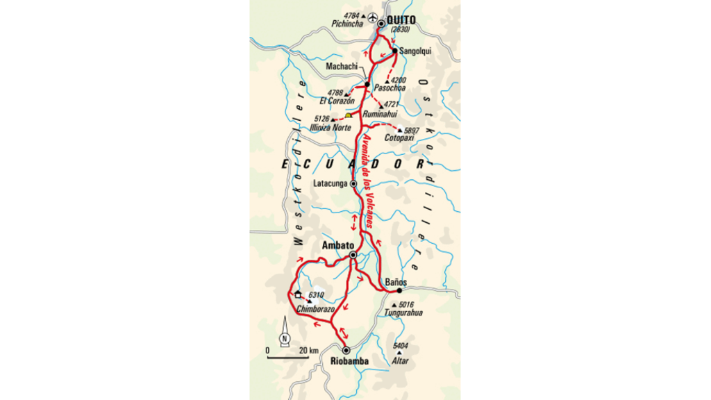 Hohe Gipfel mit guter Erreichbarkeit in einer tollen Reise für BergsteigerEcuador bietet unzählige Möglichkeiten zum Bergsteigen, für das Trekking und zum Wandern. Unsere Reise entlang der "Straße der Vulkane" ist ein beliebter und bewährter Klassiker und ein Traum für Alpinisten! Die vergletscherten Vulkankegel Ecuadors sind seit langem das klassische Ziel für passionierte Bergsteiger aus der ganzen Welt. Unsere Reiseroute ist so gewählt, dass die Akklimatisationsphase uns optimal auf die Besteigung der beiden höchsten Berge Ecuadors vorbereitet – des wunderschönen und konisch geformten Cotopaxi und des mächtigen 6.000ers Chimborazo. Das Vorprogramm der ersten acht Tage dient der systematischen Höhenanpassung: Wir unternehmen Touren auf die Vulkane Pasochoa, El Corazon und Illiniza Norte und wandern im Nationalpark Cotopaxi. Gut akklimatisiert warten danach die mit Gletschereis verzierten Vulkangipfel der andinen Gebirgskette Ecuadors auf uns. Die Kronen dieser riesigen "Eiswürfel" zeichnen sich schon von Weitem im Panorama der uns zu Füßen liegenden Provinzen ab. Erleben wir einmalige Momente auf dem 5.897 Meter hohen Cotopaxi und dem 6.268 Meter hohen Chimborazo.