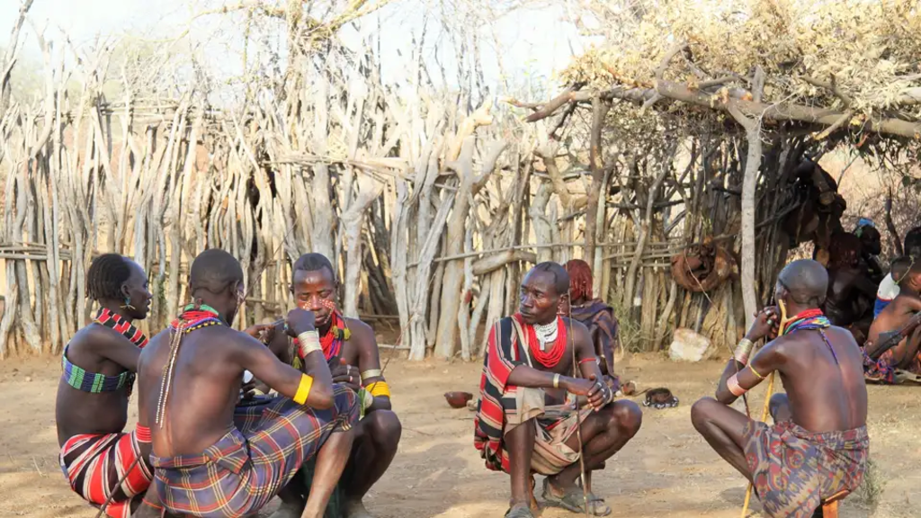 <Auf der Fahrt nach Dimeka machen wir einen Halt in Alduba und besuchen den wöchentlich stattfindenden Markt. Dieser wird von lokalen Händlern verschiedener ethnischer Gruppen besucht. Die Hamar leben hier, sowie in Dimeka und Turmi. Wie die meisten pastoralen Gruppen der Region, leben sie vor allem von ihren Herden (Milch, Fleisch, Blut) sowie in der Regenzeit von angebauter Hirse und anderen Landwirtschaftsprodukten. Rinder und Ziegen sind Lebensgrundlage und zugleich Statussymbol der Menschen. Nach unserer Mittagspause in Dimeka fahren wir weiter nach Lale. Von dort wandern wir zu unserem ersten Camp, wo wir unsere Zelte aufschlagen. -