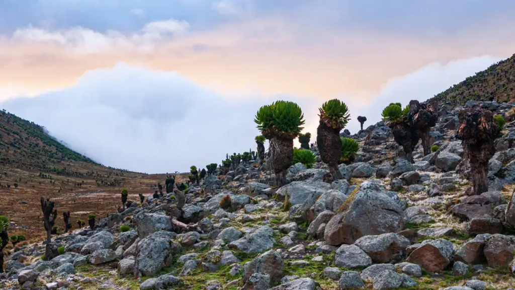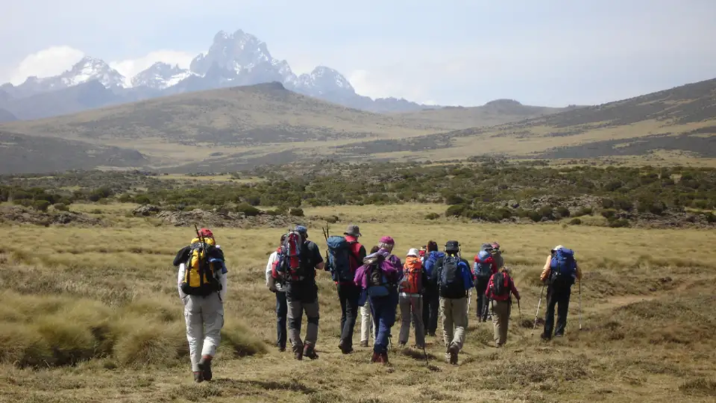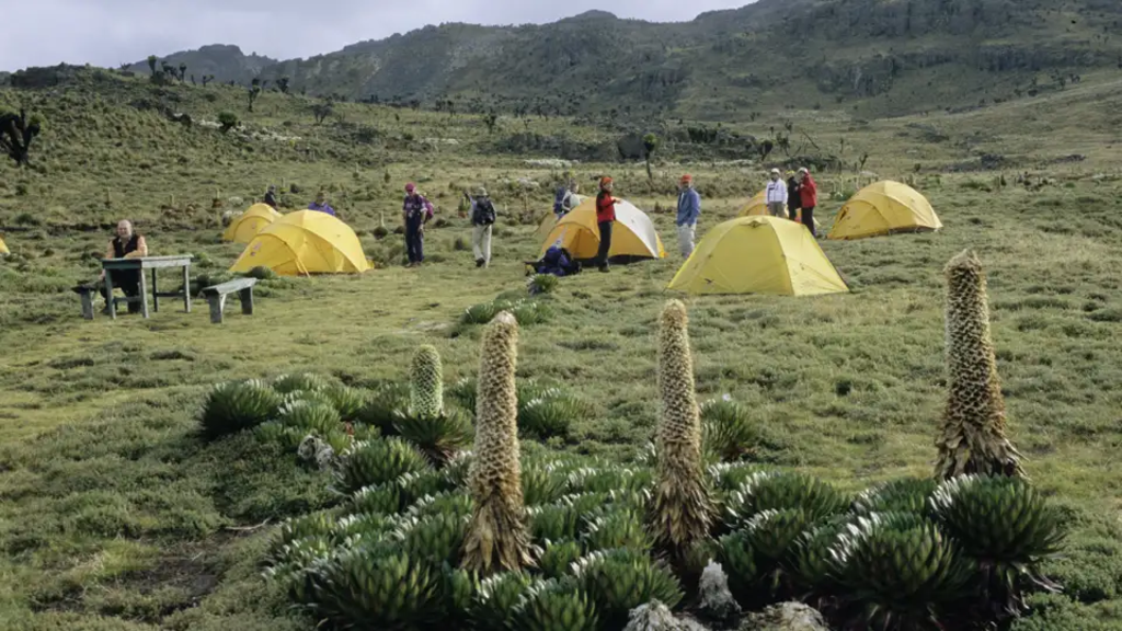 <In gemächlichem Tempo wandern wir nach dem Frühstück leicht ansteigend weiter. Wir kommen an Senezien und Lobelien vorbei, die so typisch für diese Vegetationszone und die Bergwelt Ostafrikas sind. Vor der Kulisse des schroffen Gipfelaufbaus sind sie ein einmaliges Fotomotiv. Am Allan's Point legen wir unsere Mittagsrast mit unseren Lunchpaketen ein, bevor wir nach der Nachmittagsetappe schließlich das Major's-Wildniscamp erreichen. -