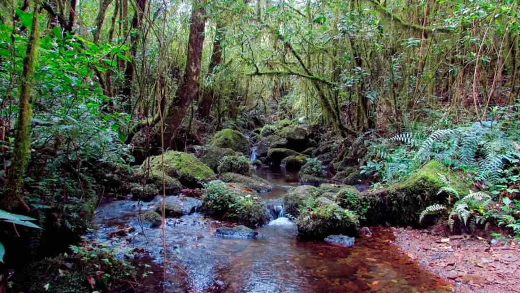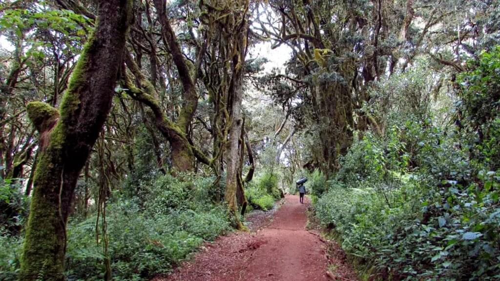 <Nach dem Frühstück fahren wir zum Marangu Gate (1.860 m). Hier treffen wir unsere Begleitmannschaft, stellen uns gegenseitig vor, erledigen die Nationalpark-Registrierung und machen uns auf den Weg. Die erste Etappe führt ca. 4 Stunden durch den dicht bewachsenen Regenwald. Es kann zu Regenfällen kommen - ganz typisch für diese Region und den tropischen Regenwald. Das Blätterdach ist dicht und grün, Flechten hängen von den Bäumen herab, die Pflanzen wachsen hier viel größer, als wir es aus Europa kennen. Der Weg steigt leicht an. Vielleicht sehen wir Stummelaffen in den Baumwipfeln hin und her springen. Auf einer Lichtung liegen die Mandara-Hütten (2.720 m), unser Tagesziel. Wer möchte, kann am Nachmittag noch einen Ausflug zum nahe gelegenen Maundi Crater machen. -