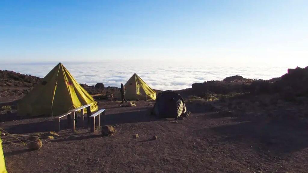 <Wir starten zeitig und wandern, nach kurzer Steigung über den Kibo-Sattel, lange durch die karge Landschaft in Richtung Kibo-Hut. Noch bevor wir diese sehen, zweigen wir rechts ab und gelangen über einen steilen Hang zur School Hut (4.715 m), unserem Tagesziel. Wir übernachten bei der Hütte in Zelten. Früh essen wir zu Abend und versuchen so viel Ruhe und Schlaf wie möglich zu bekommen, da wir kurz vor Mitternacht bereits wieder aufstehen, um uns für den Gipfeltag bereit zu machen. -