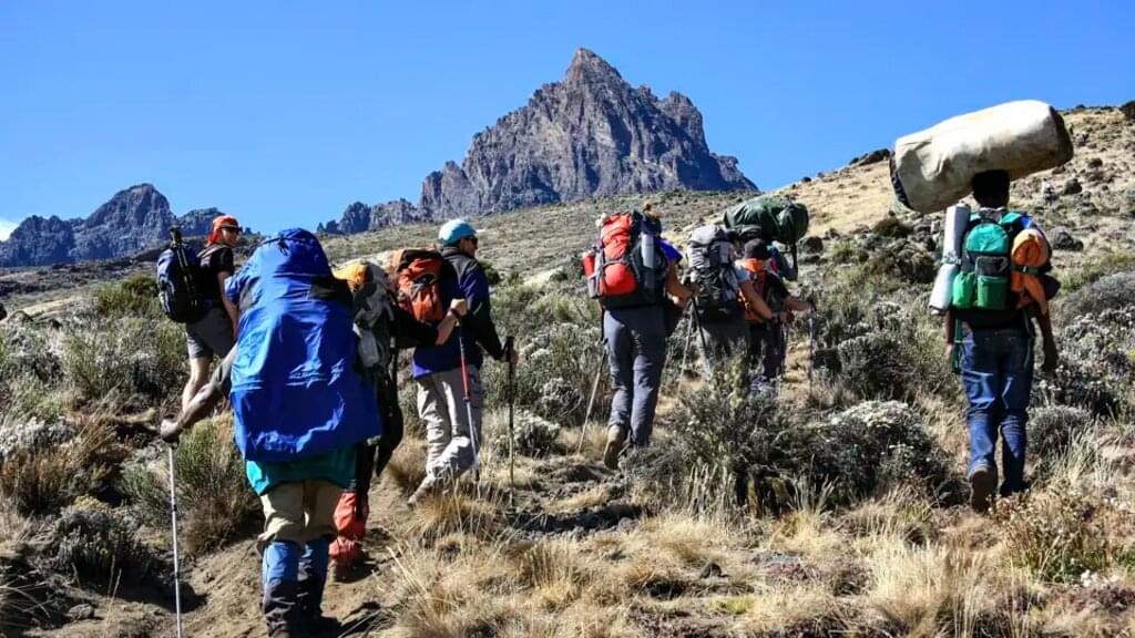 <Nach dem Frühstück fahren wir auf guter Straße um den Berg herum nach Nalemoru nahe der kenianischen Grenze, dem Ausgangspunkt der Bergbesteigung. Hier erwartet uns bereits unsere Begleitmannschaft, die aus mehreren Trägern, einem Koch, einem Assistant Guide und einem Guide besteht. Die Größe der Mannschaft ist abhängig von der Gruppengröße. Wir registrieren uns im Bergbuch und dann wandern wir los. Der erste Teil der Strecke führt an Feldern vorbei, an die sich auf dieser Seite des Berges der sehr schmale Regenwaldgürtel anschließt. Wir gehen sanft bergauf. Ohne große Anstrengung erreichen wir die Baumgrenze und das Simba Camp (2.625 m). Meist stehen die Zelte schon und die Mannschaft erwartet uns mit einem heißen Tee. Wer möchte, kann nachmittags noch ein Stückchen weiter bergauf gehen - bitte mit dem Guide absprechen. -