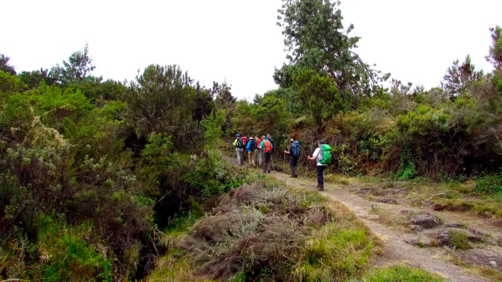 <Nach dem Frühstück fahren wir auf guter Straße um den Berg herum nach Nalemoru nahe der kenianischen Grenze, dem Ausgangspunkt der Bergbesteigung. Hier erwartet uns bereits unsere Begleitmannschaft, die aus mehreren Trägern, einem Koch, einem Assistant Guide und einem Guide besteht. Die Größe der Mannschaft ist abhängig von der Gruppengröße. Wir registrieren uns im Bergbuch und dann wandern wir los. Der erste Teil der Strecke führt an Feldern vorbei, an die sich auf dieser Seite des Berges der sehr schmale Regenwaldgürtel anschließt. Wir gehen sanft bergauf. Ohne große Anstrengung erreichen wir die Baumgrenze und das Simba Camp (2.625 m). Meist stehen die Zelte schon und die Mannschaft erwartet uns mit einem heißen Tee. Wer möchte, kann nachmittags noch ein Stückchen weiter bergauf gehen - bitte mit dem Guide absprechen. -
