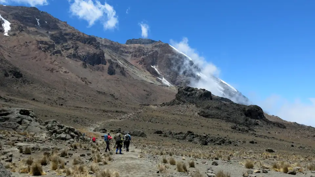 <Der Pfad führt ständig ansteigend durch Hochmoorlandschaft, oft über Wurzelwerk, ist jedoch im Allgemeinen trockener und felsiger als am Vortag. Obwohl wir langsam gehen, gewinnen wir rasch an Höhe, da der Weg nun steiler wird. Die Büsche werden niedriger und es eröffnen sich Weitblicke in die weite Ebene und hinüber zum Mount Meru. Auf ca. 3.400 m erreichen wir eine Ebene, auf der wir Mittagspause machen. Ab hier finden sich kaum noch größere Pflanzen und allmählich erreichen wir die alpine Wüste. Wir laufen durch schwarzen Lava-Sand. Die gesamte Breite des Kibo ist von diesem Plateau aus zu sehen. Links die Lent Group, oberhalb der Gardner Glacier, die Western Breach bis zum Heim Glacier mit der Breach Wall. Gegen Westen öffnet sich das Plateau und der gesamte Kamm mit dem Klute Peak (3.955 m) ist sichtbar. Schließlich erreichen wir das Shira Cave Camp auf 3.750 m. Je nach Ankunft am Camp und Kraftreserven machen wir am Nachmittag noch eine Akklimatisierungswanderung zur Shira Höhle. -