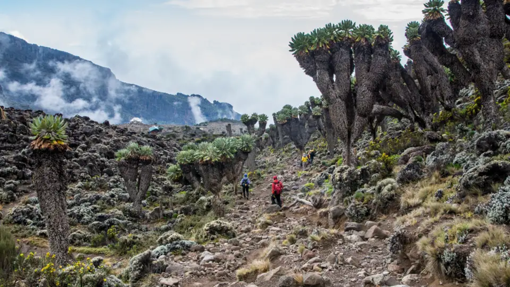 <Der heutige Tag ist aufgrund der zu überwindenden Höhenmeter anstrengend, aber der Akklimatisierung sehr zuträglich, da sich die Schlafhöhe nur um 115 Höhenmeter erhöht, wir aber etwa 850 Höhenmeter bis zum Lava Tower aufsteigen. Zunächst führt der Pfad gleichmäßig ansteigend in die alpine Wüste, bis wir auf 4.600 m zum Mittagessen den Lava Tower erreichen. Den mächtigen Kibo haben wir zum Greifen nahe bis zum Lava Tower immer im Blick. Wir gehen in südlicher Richtung auf dem Southern Circuit wieder bergab zum Barranco Camp (3.900 m), wo unsere Zelte bereits aufgestellt sind. Umgeben von Senecien genießen wir die Aussicht auf Western Breach, Heim- und Deckengletscher. -
