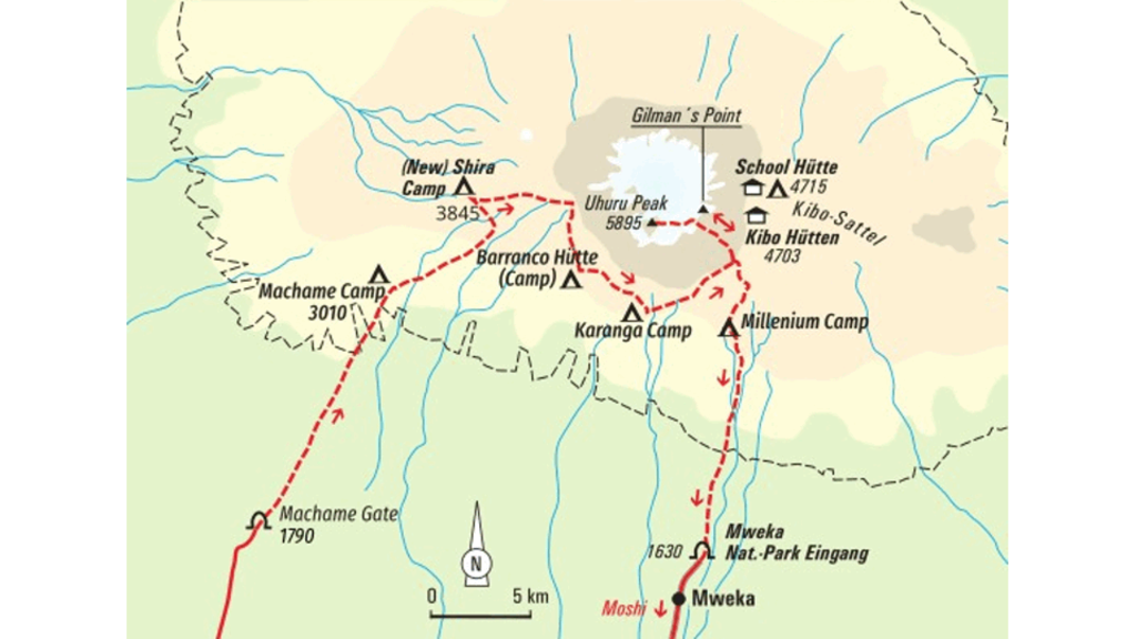 Die landschaftlich schönste Route in 7 TagenNatur und Höhe atemberaubend - die Route anspruchsvoll und abwechslungsreich. Die Machame-Route hat sich in den vergangenen Jahren zur beliebtesten Route am Kilimanjaro etabliert. Die Erfolgschancen den Uhuru Peak zu erreichen sind dank des Höhenprofils sehr gut. Durch dichten Regenwald starten wir das Abenteuer Kilimanjaro. Moos hängt von den Bäumen, am Wegrand leuchtet das Kilimanjaro-Springkraut und über unseren Köpfen springen Mantelaffen in den dichten Baumwipfeln umher. Nebel zieht hinauf in die mystischen Moorlands, wo die berühmten Riesensenecien bis in einer Höhe von 4.500 m wachsen. Nach der technisch einfachen Kraxelei an der Great Barranco Wall werden wir mit einem einmaligen Ausblick auf den Gipfelaufbau des Kibo und die südlichen Gletscher belohnt. In Richtung Südwesten spitzt der Mount Meru aus den Wolken hinaus. Am Southern Circuit gewöhnen wir uns im stetigen Auf und Ab an die Höhe. Um unsere Akklimatisierung zu verbessern, legen wir eine zusätzliche Nacht auf 4.000 m im Karanga Camp ein und können so gestärkt in die Gipfeletappe starten. Der letzte Aufstieg ist lange und mühsam, umso mehr sind wir mit Stolz und purem Glück erfüllt, wenn wir schließlich ganz oben sind und die aufgehende Sonne uns Kraft spendet... Die auch als Whiskey-Route bekannte Variante ist eine konditionell fordernde Tour die über abwechslungsreiche Pfade durch die landschaftlich schönsten Ecken des Kilimanjaro-Massivs zum weißen Dach Afrikas führt.