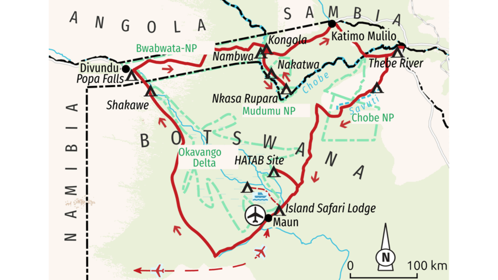 <Nach einem morgendlichen Pirschspaziergang und dem Frühstück heißt es Abschied nehmen von unserer einsamen Insel im Delta. Ein letztes Mal lassen wir uns von den Polern durch die Wasserstraßen staken, bevor wir zu einer Lodge nach Maun zurückkehren. Am Nachmittag haben wir dann Zeit, um uns am Pool auszuruhen, dem Städtchen Maun einen Besuch abzustatten oder einen optionalen Rundflug übers Delta (ca. 120 USD/Person je nach Teilnehmerzahl) zu unternehmen, denn aus der Luft bieten sich gänzlich andere Eindrücke und Aussichten. -