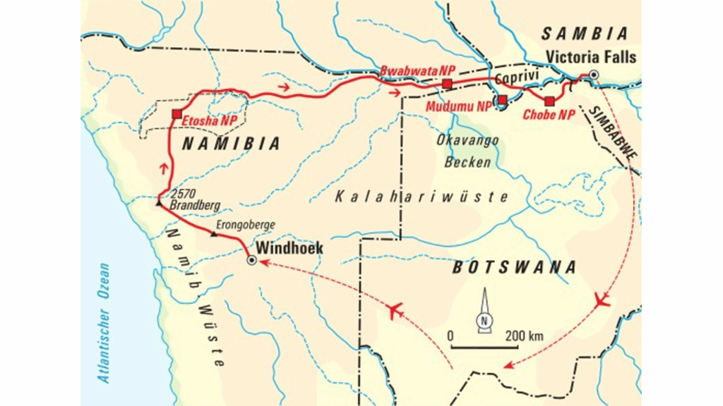 Wander- und Safarireise vom Erongogebirge über Etosha- und Chobe-Nationalpark zu den VictoriafällenSanft gleiten unsere Hände durchs seichte Wasser, in dem weiße Seerosen schwimmen. Die Sonne steht hoch, es ist fast still um uns. Wir sitzen bequem im Kanu, dem Ersatz für die traditionellen Einbaum-Boote (Mokkoro) und durchstreifen den sogenannten "Panhandle" des üppig bewachsenen Okavango Deltas. Der Wind streicht sacht durch das hohe Schilf. In der Ferne hören wir das Grunzen der Flusspferde und das Schnauben der Elefanten. Safari pur erleben wir während dieser Reise zwischen Wasser und Wüste noch häufiger: Löwen, Leoparden, Giraffen, Zebras und verschiedenste Antilopen begegnen uns im Etosha-Nationalpark. Hautnah erleben wir die afrikanische Tierwelt im offenen Geländewagen im Mudumu-Nationalpark und gehen im Chobe-Nationalpark auf Bootsafari. Vom Fluss aus nähern wir uns Krokodilen, badenden Elefanten und Wasservögeln. Das ist Afrika, wie wir es uns erträumt haben. Im Erongo Gebirge wandern wir am Hohenstein und bestaunen die verwitterten riesigen Granitkugeln und Bögen der Spitzkoppe, dem "Matterhorn Namibias". Die Wüstenberge bieten immer wieder ein faszinierendes Farbenspiel. Auf einer kleinen Wanderung lernen wir die "White Lady" im Brandberg-Massiv kennen. Wie das Spurenlesen, Feuermachen und Jagen hier abläuft, erfahren wir vom Volksstamm der Xwe im Caprivi. Mit Respekt beobachten wir die tosenden Wassermassen der Victoriafälle, die sanft Regenbögen in den Himmel zeichnen. Eine Fülle an Naturerlebnissen zwischen den orange-rot im Sonnenuntergang schimmernden Wüstenbergen und dem tiefen Blau des Chobe, Kwando und Sambesis erwarten uns!