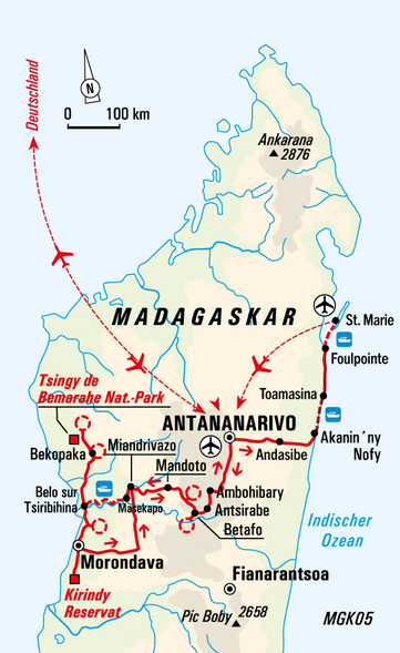 Wanderreise vom Westen in den Osten Madagaskars mit Zeit zum Baden auf der Insel Sainte Marie. Die Reise beinhaltet eine Flussfahrt mit einer Zeltübernachtung. Es werden die großen und kleinen grauen Tsingys besucht und bestiegen, im Osten fahren wir mit einem Kahn auf dem Canal des Pangalanes und besuchen das Palmarium, ein Reptilienreservat und machen einen Abstecher auf die Aye Aye Insel. Zeit zum Baden haben wir an den Sandstränden in Morondava und auf Sainte Marie. Vielfältige und nahezu ständige Begegnungen mit Tieren, wie den Lemuren, Makis und Chamäleons prägen diese Reise.