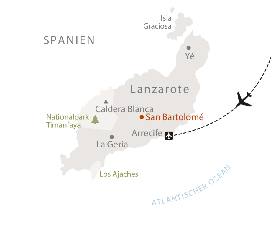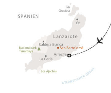 <Flug nach Arrecife/Lanzarote. Am Flughafen wirst du von einem ASI Vertreter abgeholt und in unser Hotel gefahren.