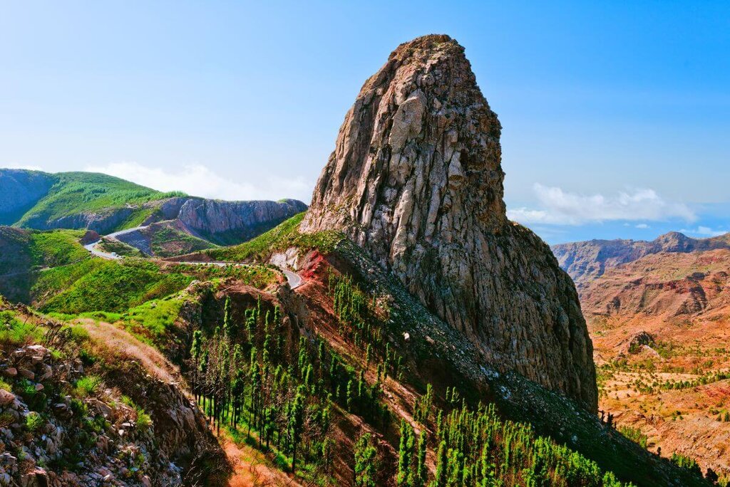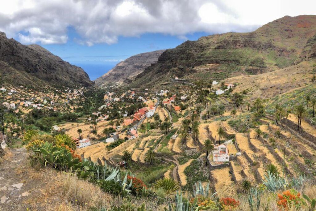 <Im Nordwesten der Insel erwartet uns die beeindruckende Durchquerung des Talkessels von Vallehermoso. Beim Abstieg eröffnen sich spektakuläre Ausblicke auf ein prachtvolles Tal, das von bizarren Felsen und tiefen Schluchten durchzogen ist. Nach einer entspannten Pause am Plaza geht es wieder bergauf. Der alte Verbindungsweg führt uns stetig aufwärts, vorbei am imposanten Fuße des Roque Cano. Während unseres Aufstiegs wechseln wir von der trocken-warmen Vegetationsstufe in den immergrünen, schattenspendenden „Monteverde“-Wald, der mit seiner üppigen Pflanzenwelt fasziniert.