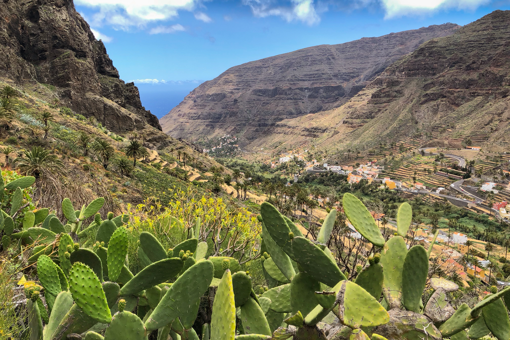 <Im Nordwesten der Insel erwartet uns die beeindruckende Durchquerung des Talkessels von Vallehermoso. Beim Abstieg eröffnen sich spektakuläre Ausblicke auf ein prachtvolles Tal, das von bizarren Felsen und tiefen Schluchten durchzogen ist. Nach einer entspannten Pause am Plaza geht es wieder bergauf. Der alte Verbindungsweg führt uns stetig aufwärts, vorbei am imposanten Fuße des Roque Cano. Während unseres Aufstiegs wechseln wir von der trocken-warmen Vegetationsstufe in den immergrünen, schattenspendenden „Monteverde“-Wald, der mit seiner üppigen Pflanzenwelt fasziniert.