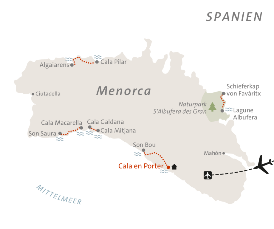 <Um 8:30 Uhr treffen wir unseren Guide an der Rezeption und lernen die Gruppe kennen – bitte bereits im Wanderoutfit erscheinen. Direkt vom Hotel starten wir zu unserer ersten Tour in Menorcas Süden und folgen dem historischen „Camí d’es Cavalls“. Der Weg führt uns durch schattige Wälder, über mehrere Schluchten und bietet immer wieder schöne Ausblicke. Unterwegs begegnen uns vielleicht einige der zahlreichen Balearischen Landschildkröten. In der Cala Bou angekommen, erwartet uns bereits unser Bus, der uns zu einem wohlverdienten Mittagessen bringt.
