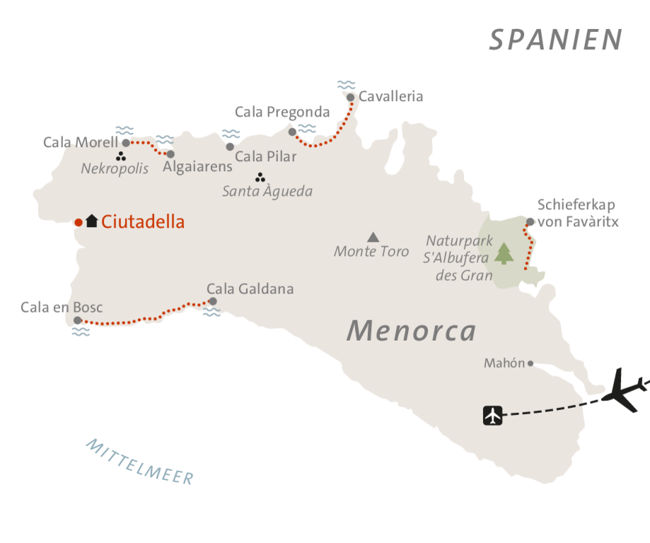 <Nach dem Frühstück begrüßt uns unser ASI Wanderführer um 8:30 Uhr an der Rezeption – bitte bereits im Wanderoutfit erscheinen. Nach dem Kennenlernen fahren wir in die Cala Morell und besichtigen die beeindruckende Nekropolis. Anschließend folgen wir einem Küstenpfad über ein von Macchia bewachsenes Plateau, bevor wir wieder das Meer erreichen. Der Wind, der Salzgeruch und der Blick auf das tiefblaue Wasser begleiten uns bis zum Strand von Cala Algaiarens, wo eine Badepause möglich ist. In Ciutadella genießen wir zum Abschluss ein wohlverdientes Mittagessen in mediterraner Atmosphäre.