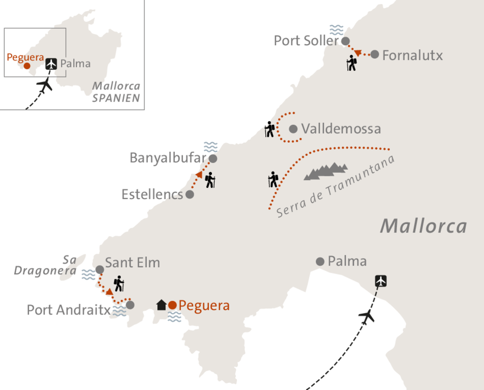Während unserer Wanderwoche wohnen wir komfortabel im 4-Sterne-Hotel, das uns als gemütliche Basis für alle Wanderungen dient. An jedem Wandertag werden wir von unserem privaten Bus abgeholt und zu den schönsten Regionen der Sierra Tramuntana gebracht. Gewandert wird nur mit leichtem Tagesrucksack – das Hauptgepäck bleibt bequem im Hotel. Nach jeder Tour erwartet uns ein landestypisches Mittagessen mit mallorquinischer Küche, begleitet von Wein, Wasser und Kaffee. Wir starten nach dem Frühstück und kehren am Nachmittag zurück – denn Busfahrten, Wanderungen und kulinarische Genüsse brauchen Zeit. Und genau diese Zeit nehmen wir uns: um die Eindrücke wirken zu lassen, die Natur zu erleben und die schönsten Tage des Jahres in aller Ruhe zu genießen.