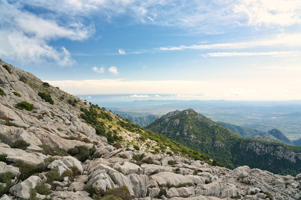 <Im Herzen der Serra de Tramuntana liegen malerisch die Stauseen Gorg Blau und Cuber. Hier starten wir zu der wohl schönsten Panoramawanderung Mallorcas. Über den alten Schneesammlerpfad erreichen wir bald unseren ersten von drei Gipfeln, die über 1.000 Meter Seehöhe liegen. Wir genießen den Ausblick über ganz Mallorca, bei gutem Wetter sehen wir sogar bis Menorca. Nun beginnt unser teils wegloser Pfad: ohne viel an Höhe zu verlieren wandern wir von Gipfel zu Gipfel.