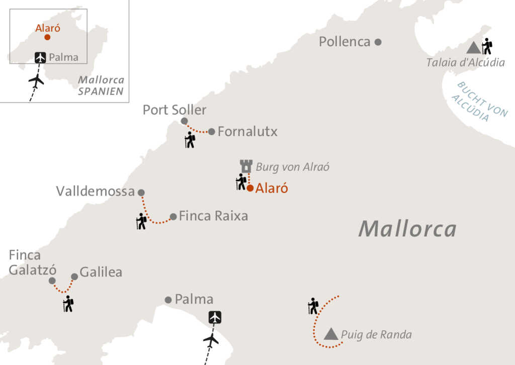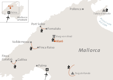 <Direkt vom Hotel starten wir unsere Wanderung auf einem gut angelegten Weg zur alten, historisch bedeutenden Festung von Alaro auf dem gleichnamigen Berg, der wie ein markanter „Backenzahn“ der Sierra de Tramuntana vorgelagert ist. Oben angekommen, genießen wir herrliche Ausblicke über die umliegende Landschaft und machen eine wohlverdiente Rast. Anschließend führt der Weg wieder bergab zurück in unser Dorf.
