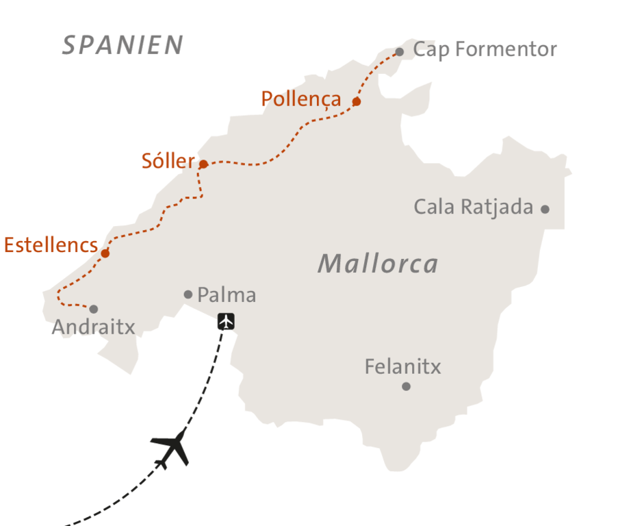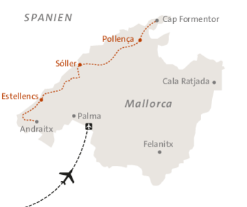 <Von Deià aus folgen wir einem alten Küstenweg, der uns mit fantastischen Ausblicken auf das tiefblaue Meer begleitet. Die Landschaft ist offen und sonnig, immer wieder säumen knorrige Olivenbäume und Steinterrassen unseren Weg. In der Ferne grüßen die Dächer von Sóller, während wir gemächlich durch die mediterrane Hügellandschaft wandern. Die letzten Kilometer führen durch Zitronenhaine, bevor wir das lebendige Städtchen Sóller erreichen.