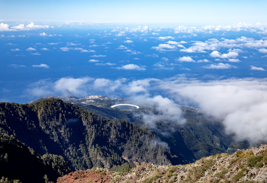 Vor uns breitet sich die wilde Bergregion der einstigen Ureinwohner, der Guanchen, aus. In der Ferne liegt das fruchtbare Aridanetal mit dem Dorf El Paso – ein beeindruckender Ausblick und ein unvergessliches Naturerlebnis, das die Vielfalt und Schönheit La Palmas zeigt.