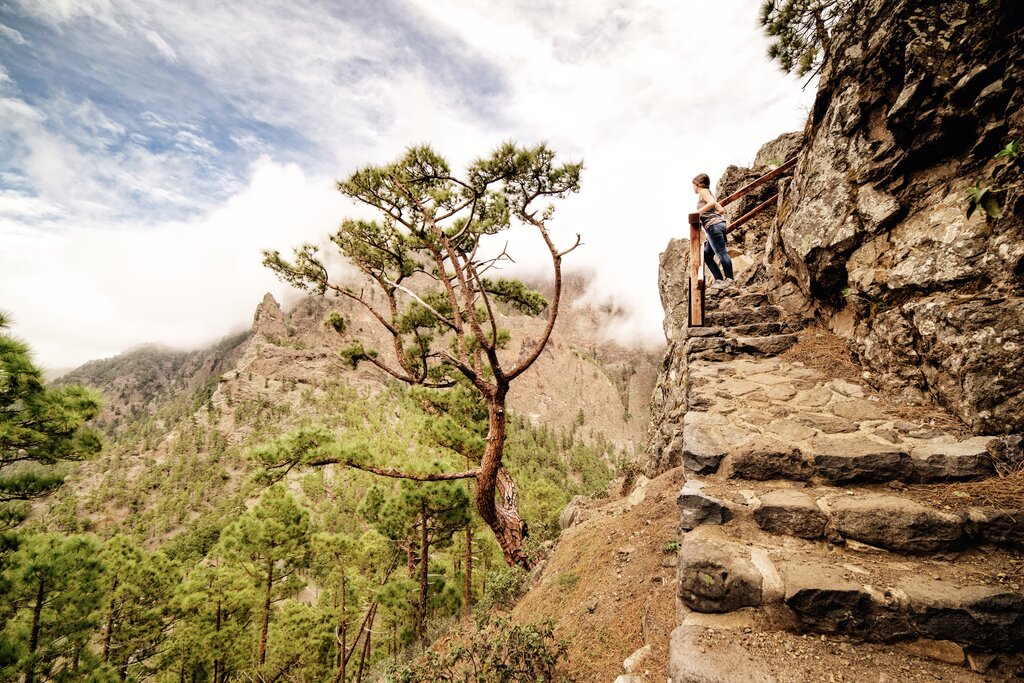 <Heute erkunden wir den Westen La Palmas. Unsere erste kleine Wanderung führt uns in den Nationalpark Caldera de Taburiente, wo uns beeindruckende Einblicke in den gewaltigen Krater erwarten, gesäumt von kanarischer Urpinie.