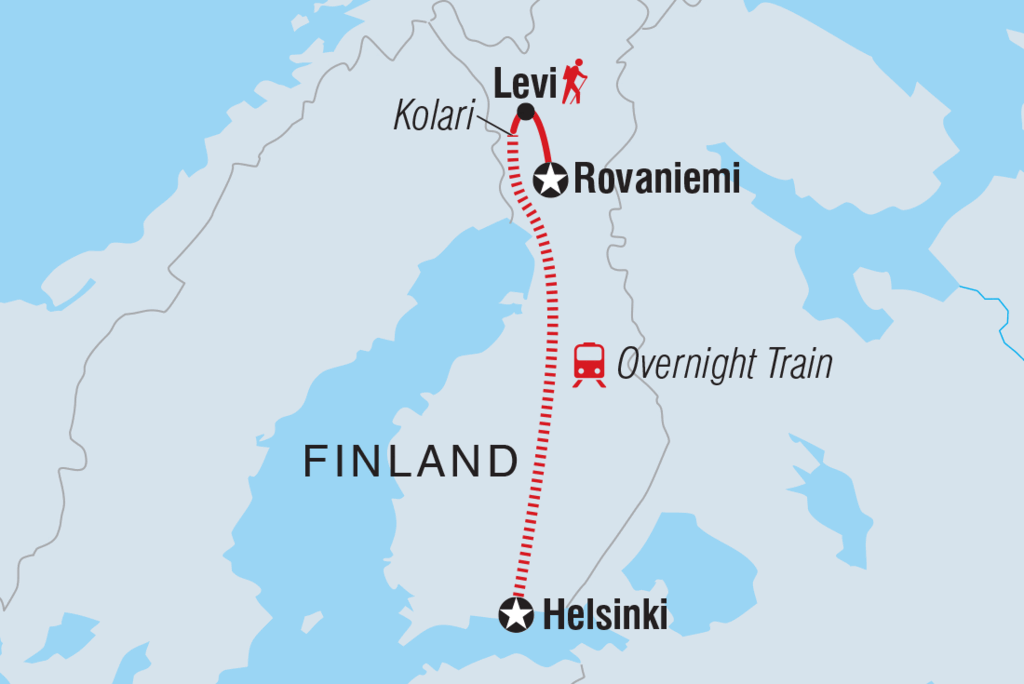 <Begleite deinen Reiseleiter am Morgen auf einen Orientierungsspaziergang durch Helsinki. Anschließend fährst du mit dem Zug zum Heureka Finnish Science Center, wo du eine Führung bekommst. Die Kinder werden es lieben, sich bei all den interaktiven Exponaten wie ein verrückter Wissenschaftler zu fühlen! Später kehrst du nach Helsinki zurück und hast etwas Freizeit, um dich auf deine heutige Reise vorzubereiten. Am Abend besteigst du den berühmten "Santa Claus Express", einen komfortablen Nachtzug nach Rovaniemi (ca. 12 Stunden), das vielen als Heimatstadt des Weihnachtsmanns bekannt ist und nur 6 km südlich des Polarkreises liegt.