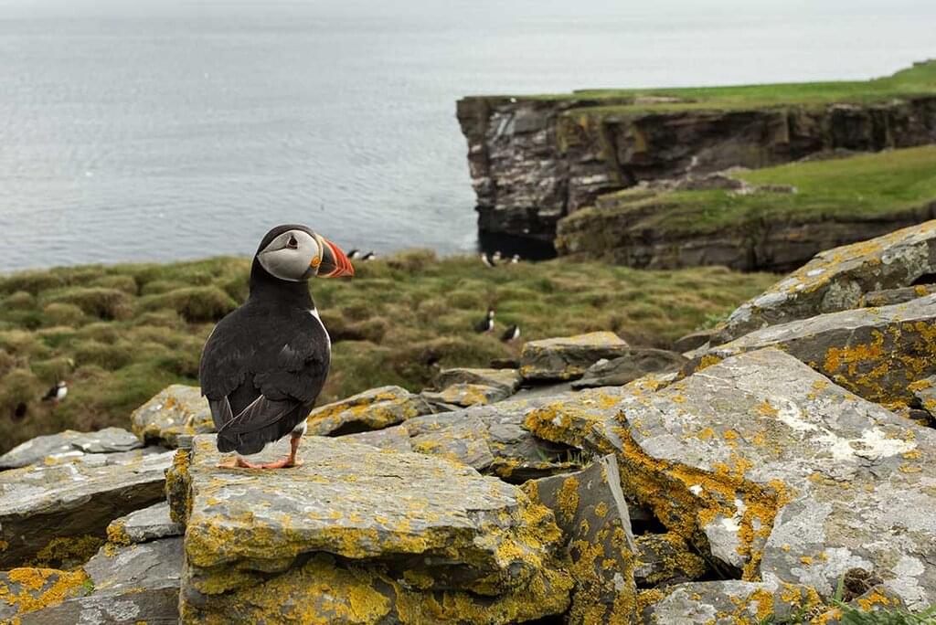 <Die abgelegenste bewohnte Insel Großbritanniens, die außergewöhnliche Fair Isle, liegt auf halbem Weg zwischen den Shetland- und Orkney-Inseln. Die Landschaft von Fair Isle ist von schroffer Schönheit und vielfältig: Felder und Moore werden von Steilküsten und einer erstaunlichen Anzahl von Felsen, natürlichen Bögen und Höhlen dominiert. Trotz ihrer geringen Größe bietet die Insel Aktivitäten für Geschichts-, Natur- und Fotofreunde gleichermaßen. Besuche das Museum und tauche ein in lokale Artefakte, Fotos, Strickwaren und andere historische Erinnerungsstücke. Vergiss nicht, ein Foto von der klassischen roten Telefonzelle von 1935 neben dem Postamt zu machen! In den Gewässern um Fair Isle sind Orcas heimisch, die manchmal in die Nähe kommen, um Robben zu jagen. Aber am bekanntesten ist die Insel für ihre Küstenklippen, die im Frühling und Sommer von Seevögeln bevölkert sind. Die Hauptattraktion ist der Papageientaucher, ein clownsähnlicher Vogel, der seine Nester in den grasbewachsenen flachen Spitzen der Klippen der Insel baut. Die leicht zugänglichen grasbewachsenen Ufer der Fair Isle machen sie zu einem der besten Orte auf den Shetlands (wenn nicht sogar auf den ganzen schottischen Inseln!), um diese farbenfrohen Tiere zu beobachten. Eissturmvögel, Dreizehenmöwen, Sturmschwalben, Tordalken und Trottellummen können über den offenen Gewässern gesichtet werden. In der Gemeinde der Crofter, Kunsthandwerker und Künstler kannst du dir vielleicht einen traditionellen Fair Isle Pullover kaufen, der dich für den Rest deiner Arktisreise warm hält. -