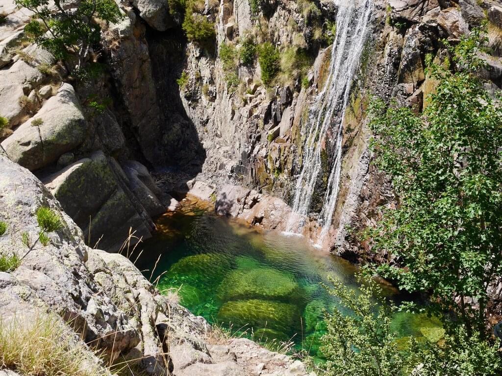 <Wir starten unsere Wanderung am Col de Vergio, dem höchsten Straßenpass Korsikas. Ein schattiger Waldpfad führt uns zunächst über große Granitplatten hinab, bevor sich die Landschaft öffnet und weite Blicke auf die umliegenden Berge freigibt. Bald erreichen wir den Cascade de Radule, einen rund 25 Meter hohen Wasserfall des Golo, der über mehrere Stufen in ein natürliches Becken stürzt – ideal für eine erfrischende Pause im klaren Wasser. Anschließend steigen wir gleichmäßig zur Bocca Guagnarola (1.838 m) auf, wo uns ein fantastisches Panorama erwartet. Der Rückweg folgt einem Abschnitt des legendären GR 20 zurück Richtung Col de Vergio.