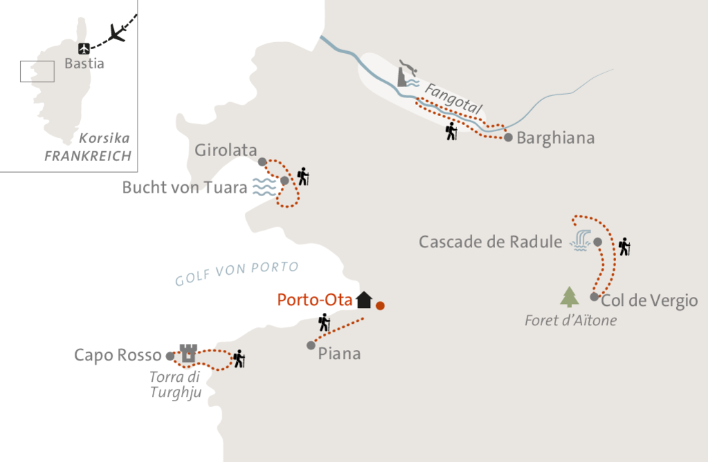Die einzigartige Insel Korsika ist ein Paradies für Wanderer – ihre wilde Schönheit verzaubert jeden Besucher. Begleite uns auf dieser abwechslungsreichen Wanderreise und erlebe das Beste, was Korsika zu bieten hat. Wir erfrischen uns in den kristallklaren Naturpools des berühmten Fango-Tals, wandern auf den legendären Pfaden des GR 20 oder entdecken das versteckte Juwel Girolata, ein charmantes Fischerdorf, das nur zu Fuß oder per Boot erreichbar ist. Eine Wanderung durch die atemberaubenden Felsformationen der Calanche ist ein Muss für jeden Korsika-Besucher. Die bizarren, rot glühenden Felsen wird man so schnell nicht wieder vergessen. Freue dich auf eine einzigartige Wanderwoche auf der „Île de Beauté“ – einer Insel, die mit ihrer unberührten Natur, ihren spektakulären Landschaften und ihren versteckten Schätzen jeden Wanderer in ihren Bann zieht.