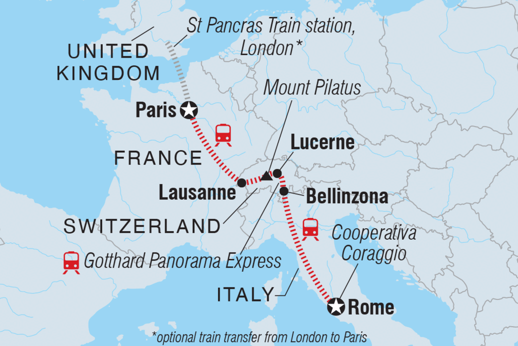 Erlebe ein zehntägiges Abenteuer mit der Bahn von Paris nach Rom. Du beginnst in der Stadt der Lichter und fährst dann in die Schweiz, um einen Ausflug in die Berge zu machen. In Lausanne kannst du die ikonische Kathedrale besichtigen und vielleicht die zum UNESCO-Welterbe gehörenden Weinbergterrassen von Lavaux für eine Weinverkostung besuchen. Mit dem Gotthard Panorama Express fährst du nach Bellinzona, wo du mit einer weiteren Seilbahn die Aussicht auf die Berge genießen kannst. Mach dich auf den Weg nach Rom, wo du genügend Freizeit hast, um eines der sieben Weltwunder zu besichtigen und ein frisches Mittagessen bei einem Partner der Intrepid Foundation, der Cooperativa Coraggio, einzunehmen.