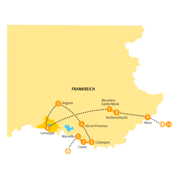 <Nach dem Frühstück fährst du nach Cassis und dort machst du einen kleinen Rundgang durch diesen kleinen mediterranen Fischereihafen. Der malerische Hafen ist von pastellfarbenen Gebäuden, Straßencafés und Restaurants umgeben. Heutzutage ist Cassis besonders für seine Calanques bekannt - fjordähnliche Buchten mit glasklarem Wasser, eingebettet zwischen malerischen Felsklippen. Im Jahr 2012 wurde hier Frankreichs jüngster Nationalpark gegründet, der knapp 88.000 Hektar Land sowie 141.000 Hektar Meeresgebiet umfasst. Auf einer Bootstour kannst du die schönsten dieser Buchten bewundern. Am Nachmittag verabschiedest du dich von der Küste und fährst Richtung Norden. Unterwegs besuchst du ein Weingut und kannst die edlen Tropfen selbstverständlich auch verkosten. Dann geht es weiter durch die eindrucksvollen Landschaften der Provence. Lavendelfelder, Weinberge, Pinienwälder, zerklüftete Felsen und hier und da ein pittoreskes Örtchen prägen das Landschaftsbild. In den nächsten Tagen wirst du mehr von dieser malerischen Region erkunden. Sobald du in Aix-en-Provence angekommen bist, kannst du bei einem kleinen Spaziergang die Stadt erkunden.