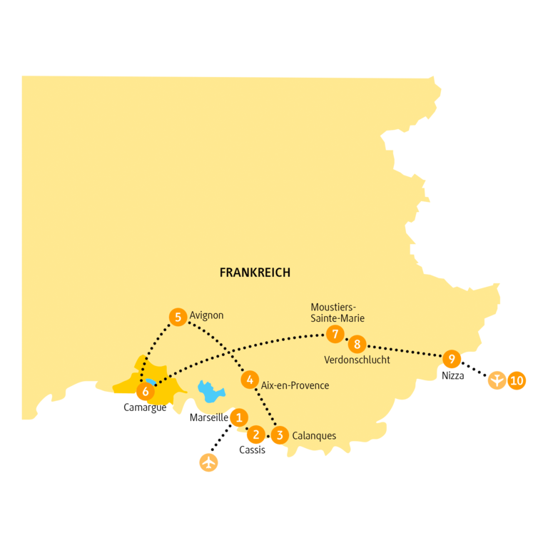 <In Frankreich sagt man »on y va« – los geht’s! Mit gepackten Koffern begibst du dich zum Flughafen, von wo aus du in die Provence startest. Vielleicht kannst du schon aus dem Flugzeug heraus einen kurzen Blick auf das tiefblaue Mittelmeer erhaschen, bevor du am Flughafen von Marseille landest. Hier wirst du abgeholt und in deine Unterkunft im Herzen der Stadt gebracht. Der Rest des Tages steht zu deiner freien Verfügung. Wie wäre es schon mal mit einem Spaziergang zum Vieux Port – dem alten Hafen –, an dem das Leben nur so pulsiert?