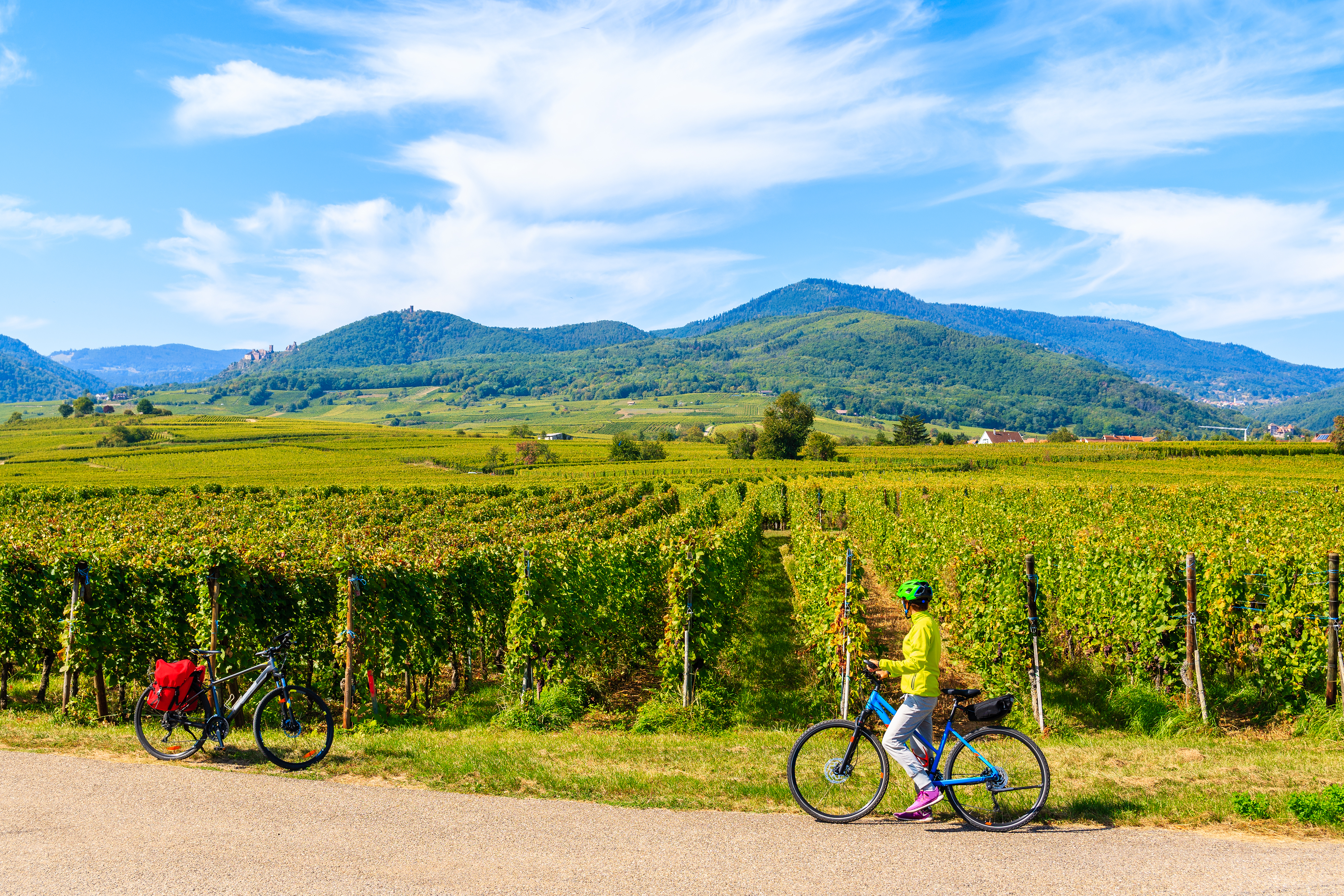 <Unser Radweg führt Sie durch die berühmtesten Weinlagen des Elsass. Inmitten der weinbehangenen Rebenlandschaft haben sich hier mittelalterliche Ortsformen erhalten. Wie mit der Natur verwachsen füllen sie die Senken zwischen dem frischen Grün der Weinberge aus. Kirchenglocken klingen aus der Ferne zu uns herüber und gedämpftes Hahnenkrähen ist zu hören, wenn wir uns von den hübschen Dörfern entfernen. Auf verschwiegenen Wegen durch die hügeligen, leicht schottrigen Weinbergspfade nähern wir uns am späten Mittag dem kleinen Weiler Riquewihr, dessen Torturm unbestritten als der schönste im gesamten Elsass gilt. Ein Haus scheint hier in seiner Pracht das andere übertreffen zu wollen! Wunderschön anzusehen sind auch die Rückseiten der Häuser, wo sich versteckte Innenhöfe mit umgehenden Holzgalerien und Blumenranken überwucherte Ziehbrunnen entdecken lassen. Am Nachmittag bringt Sie ein kurzer Transfer hinauf zur Hohkönigsburg. Sie liegt auf einem Felssporn, der hoch über St. Hippolyte aufragt. Nach der Besichtigung rollt Ihr Rad die letzte Etappe durch sattgrünen Vogesenwald sanft bergab und Sie erreichen das inmitten von Weinbergen gelegene Saint-Hippolyte.